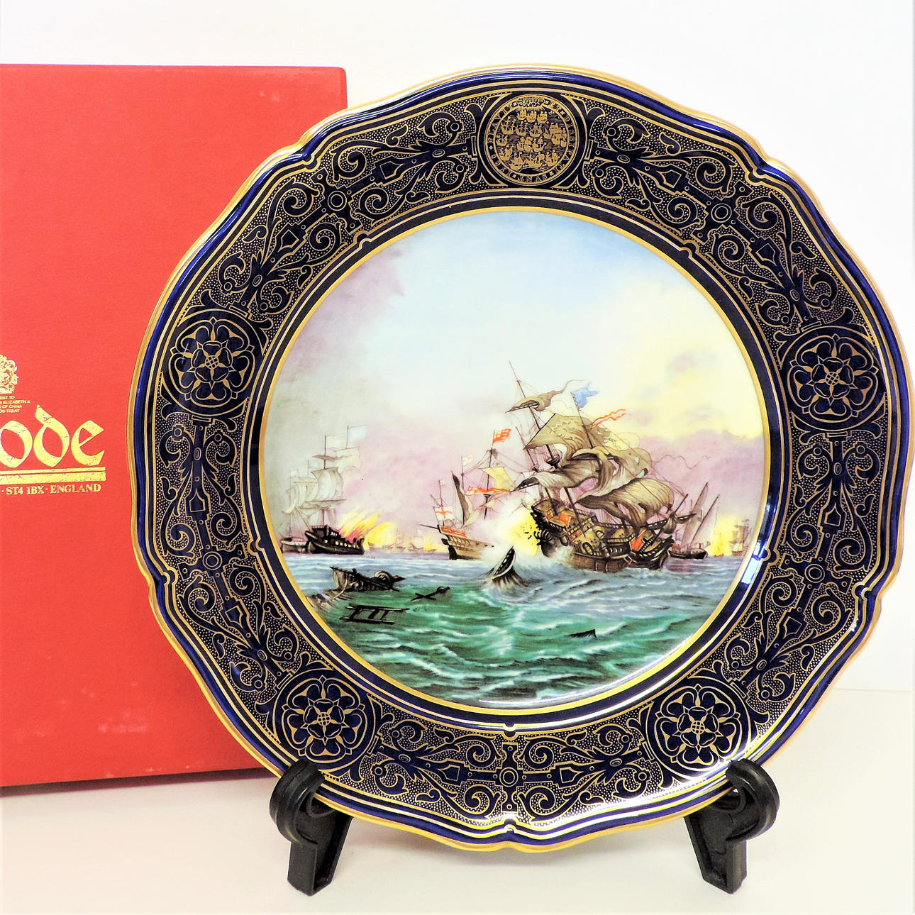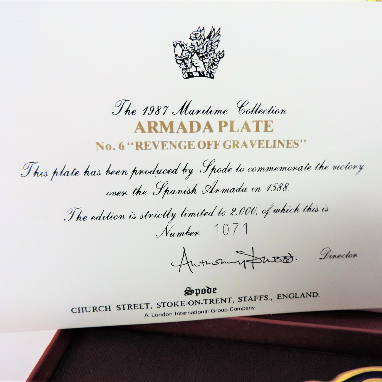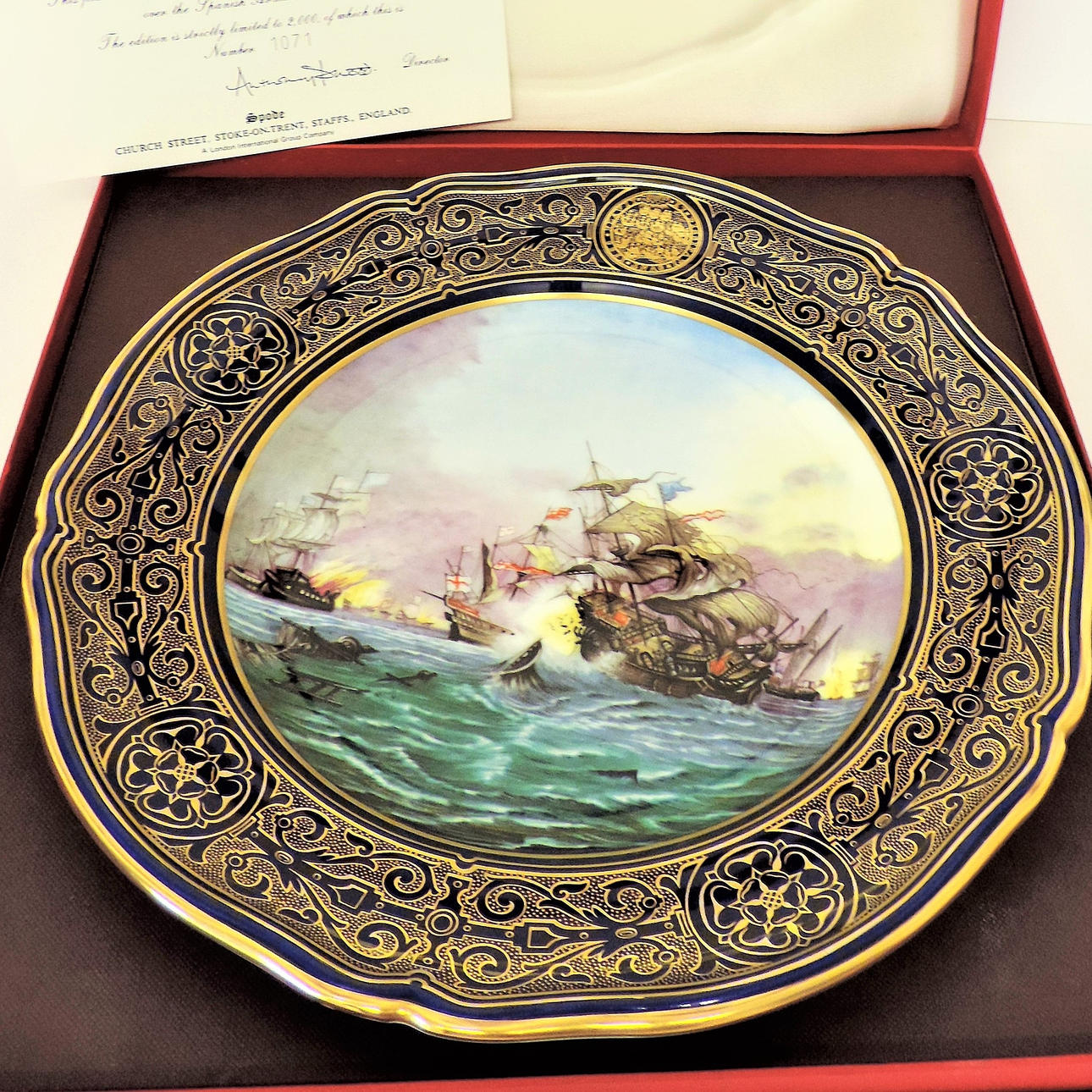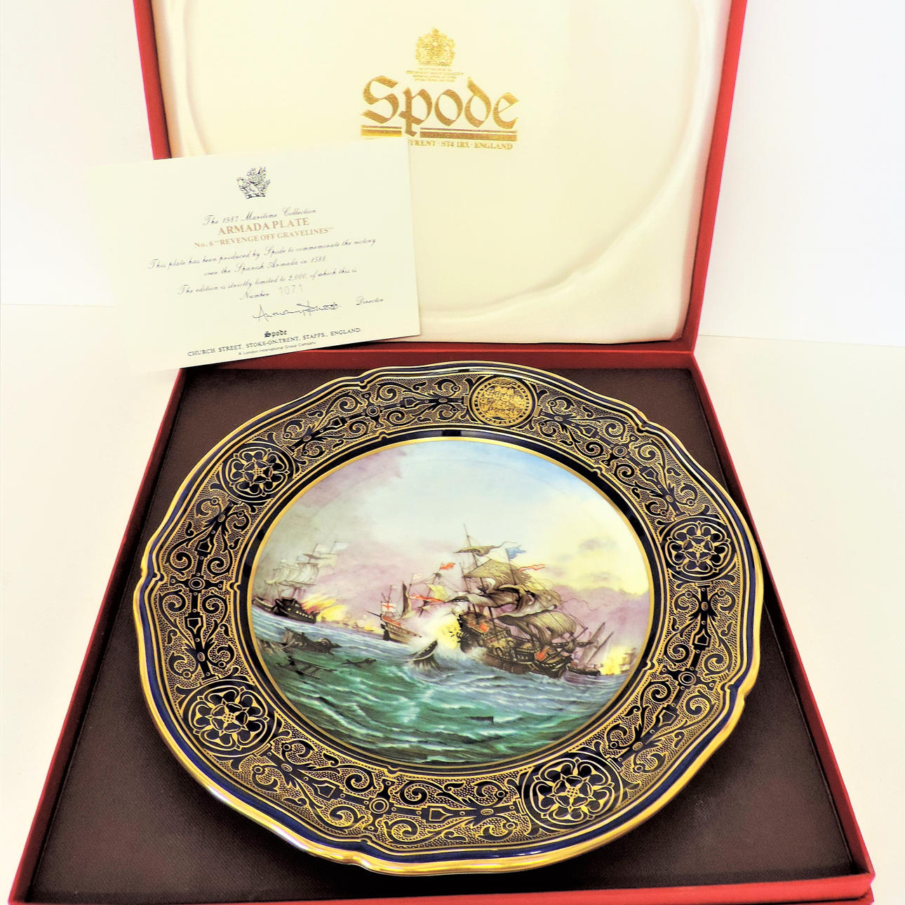 Spode Porslin Armada Plate 'Revenge off Gravelines” Limited Edition med certifikat. Spode 1987 Maritime Collection Armada Plate 'Hämnd av gruslines'. Plattan mäter 24cm diameter är nummer 1071 av 2000 Worldwide limited edition. Det är i original presentationsrutan med certifikat.