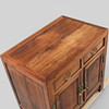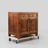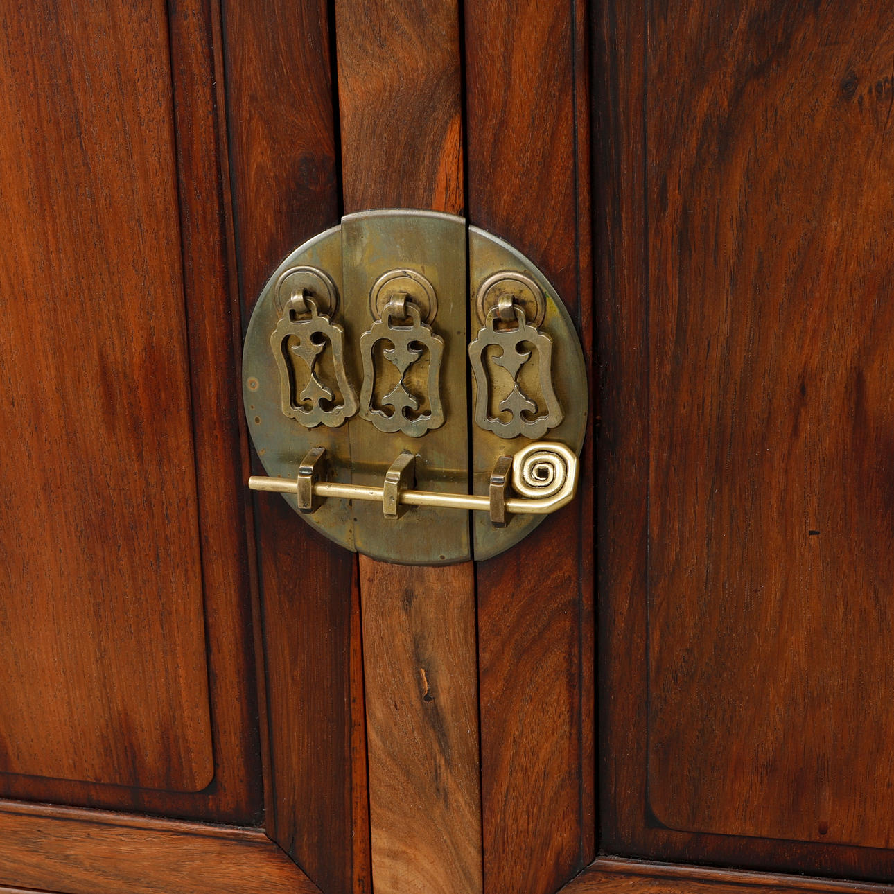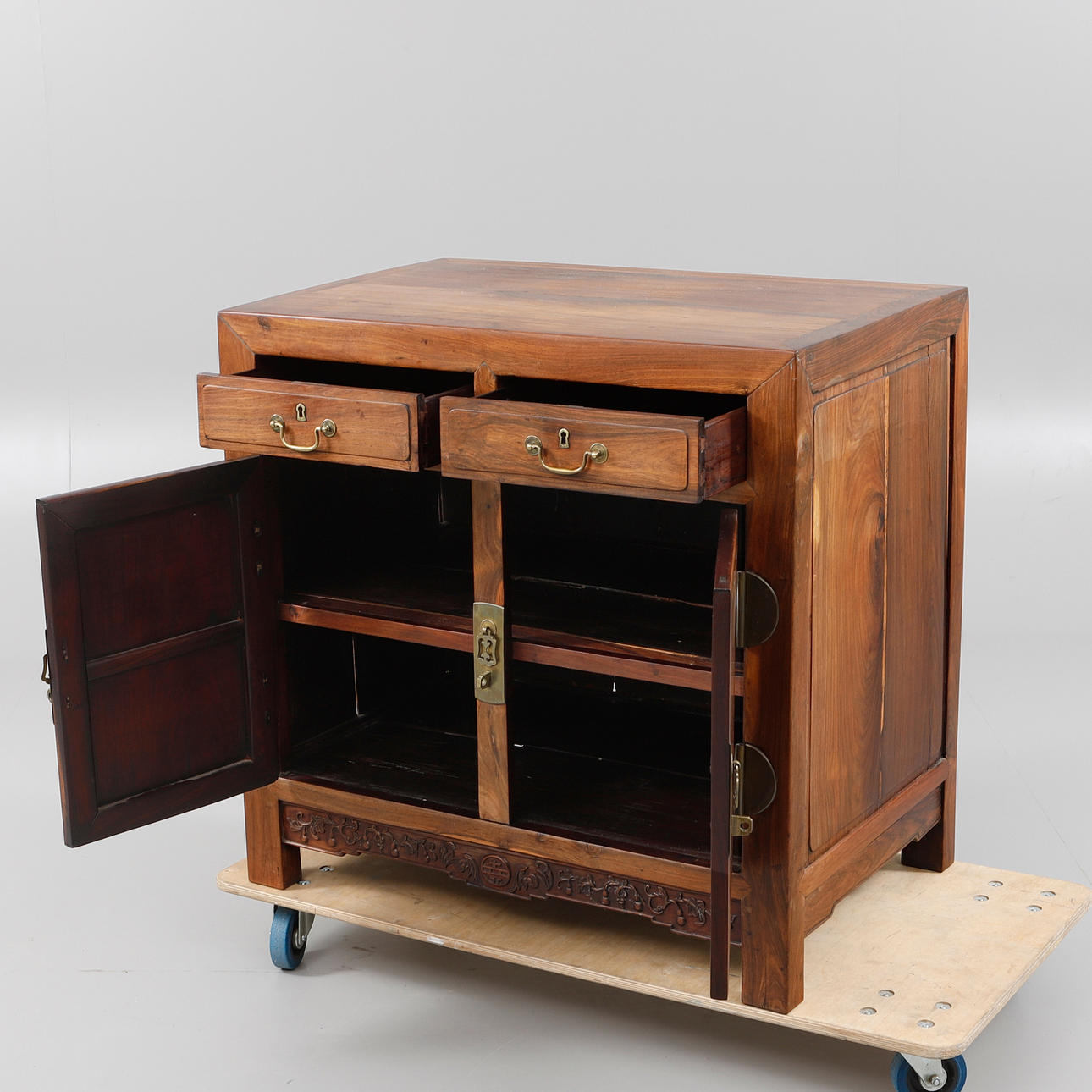 Beslag i gulmetall. Två lådor samt ett dörrpar. Längd 90 cm, bredd 58 cm, höjd 87 cm.