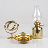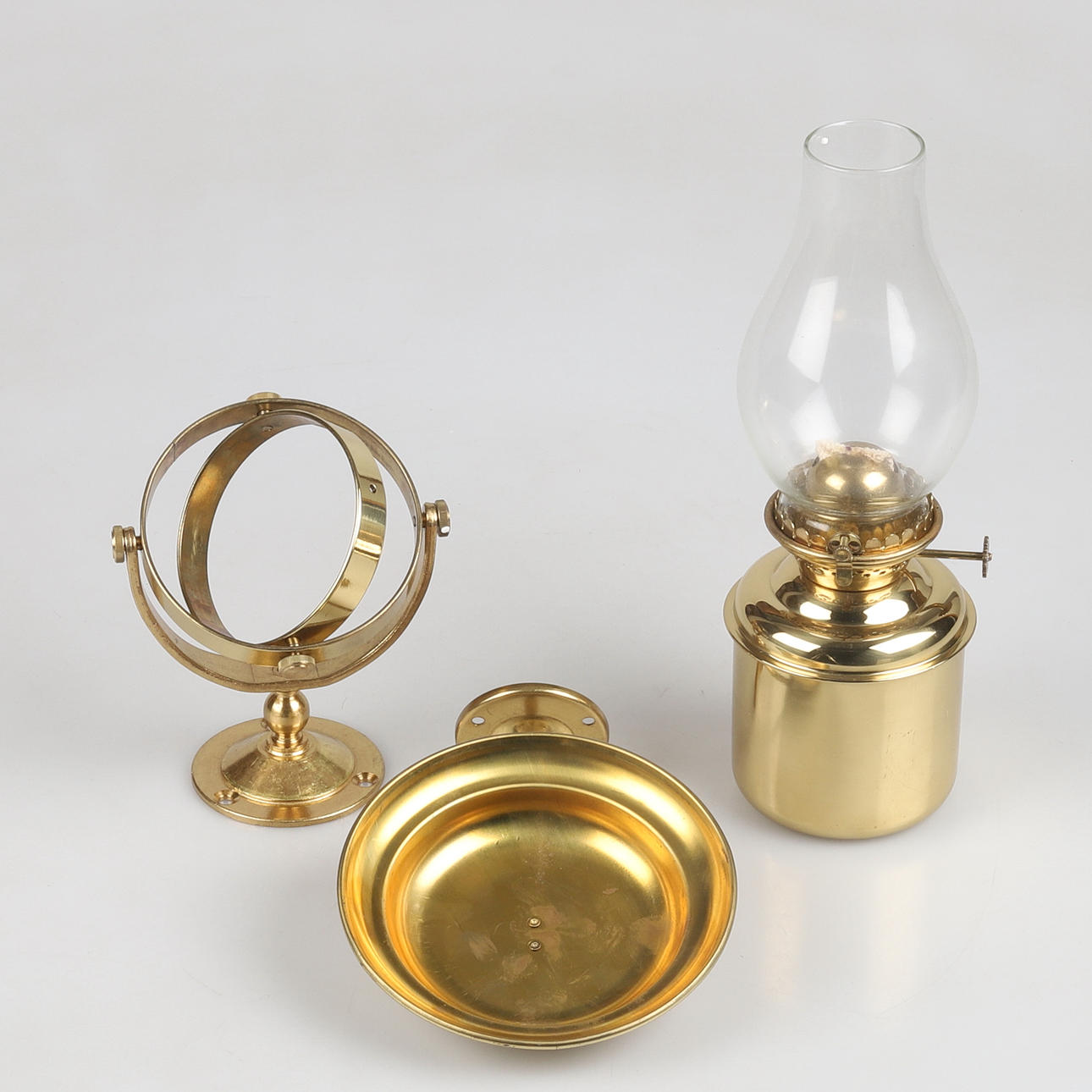 Fotogenlampa med kardansk upphängning samt tillhörande sotskydd. Mässing och glas.
