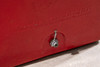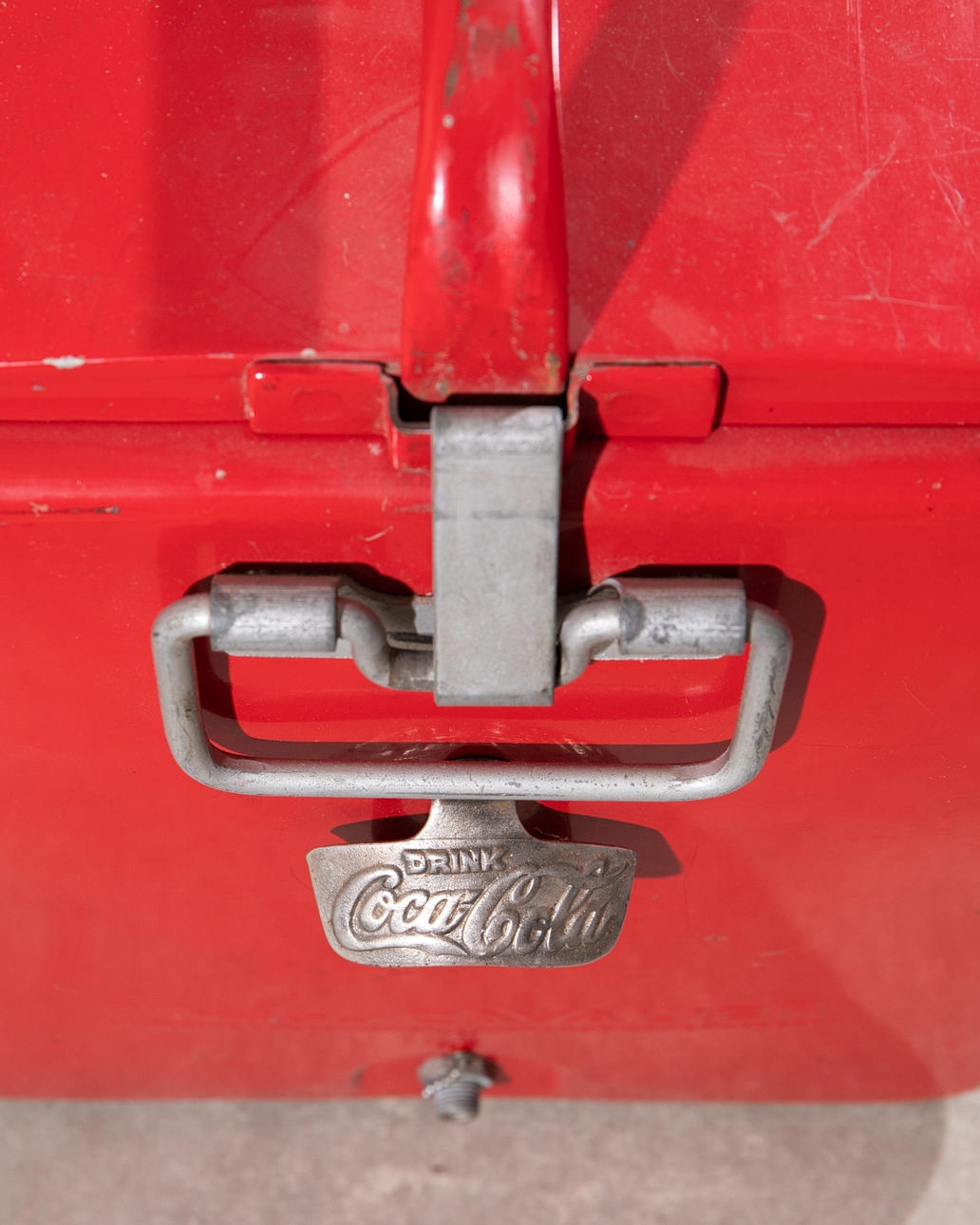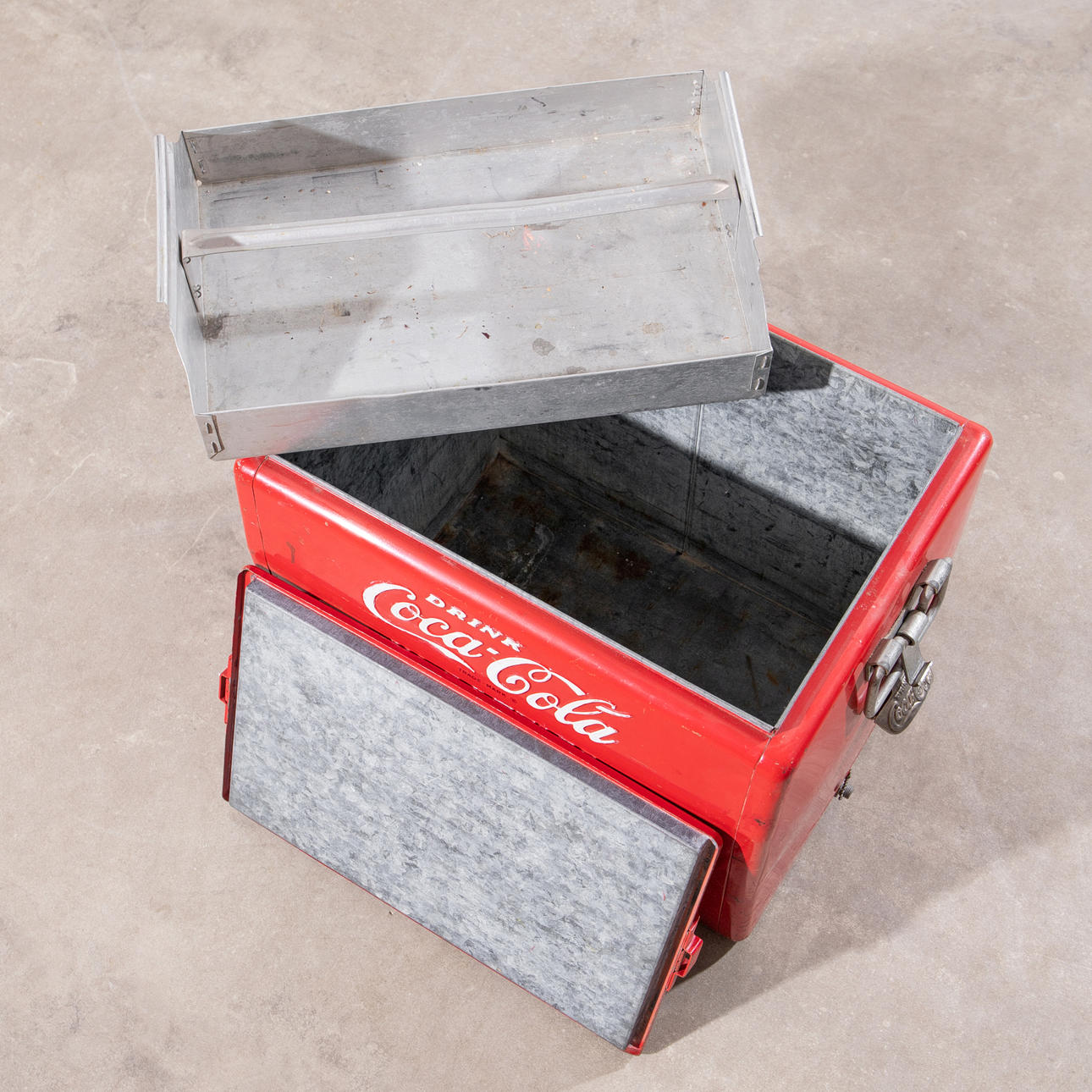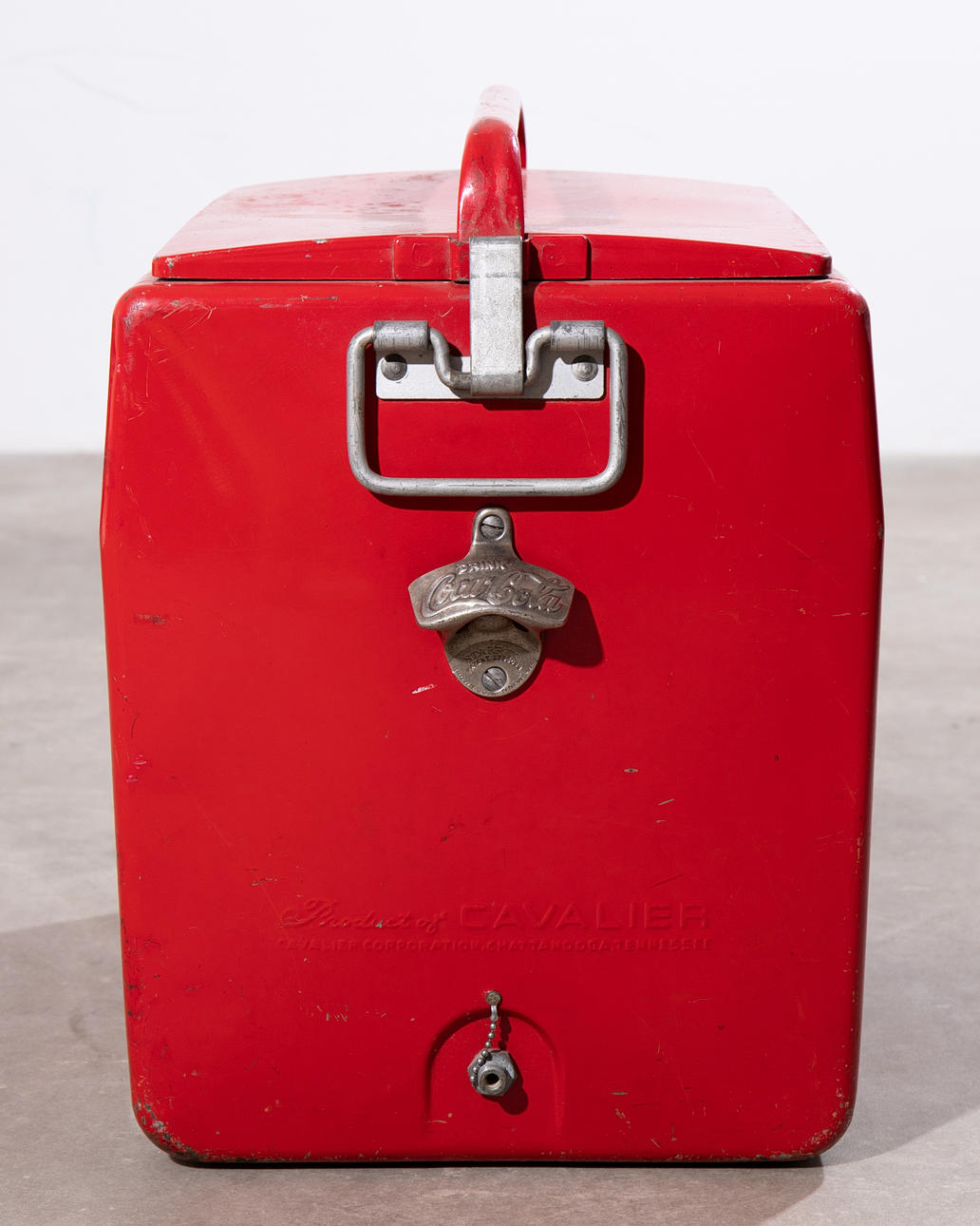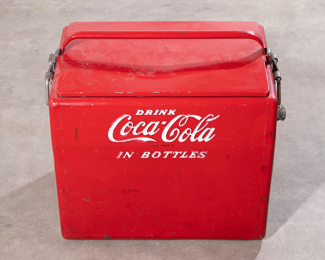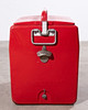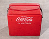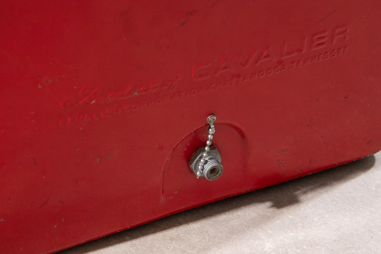 1950-talets kylare. Rödmålad metall med kontrasterande vit, upphöjd bokstäver, galvaniserad interiör. H. 46, B. 50, D. 34 cm.
