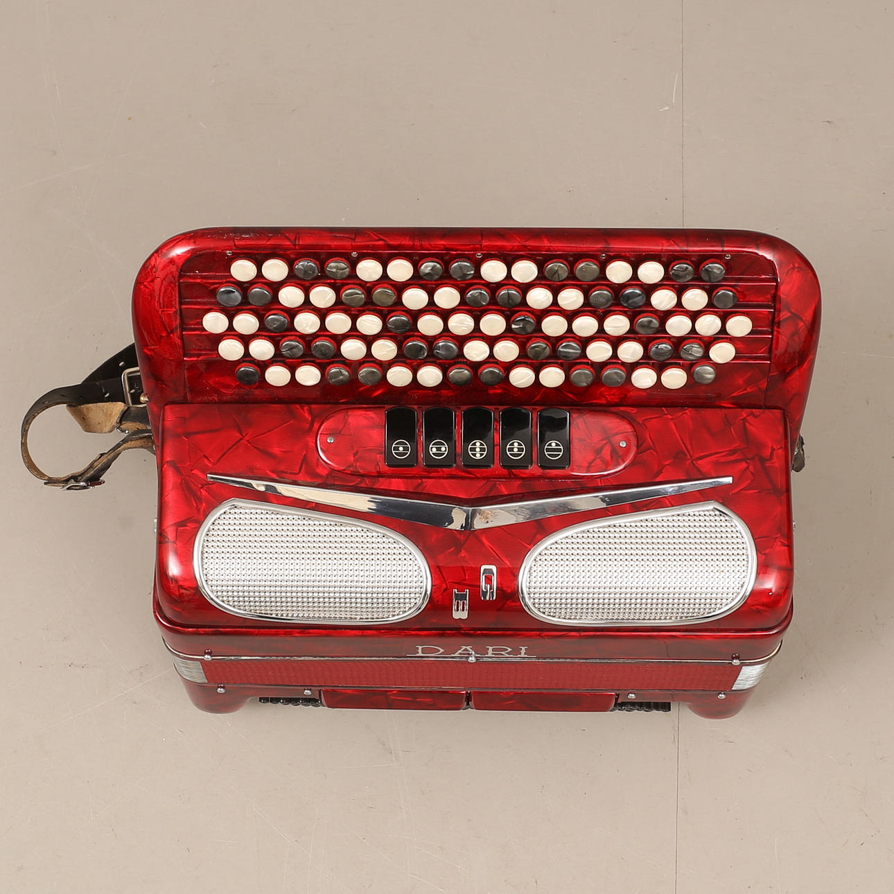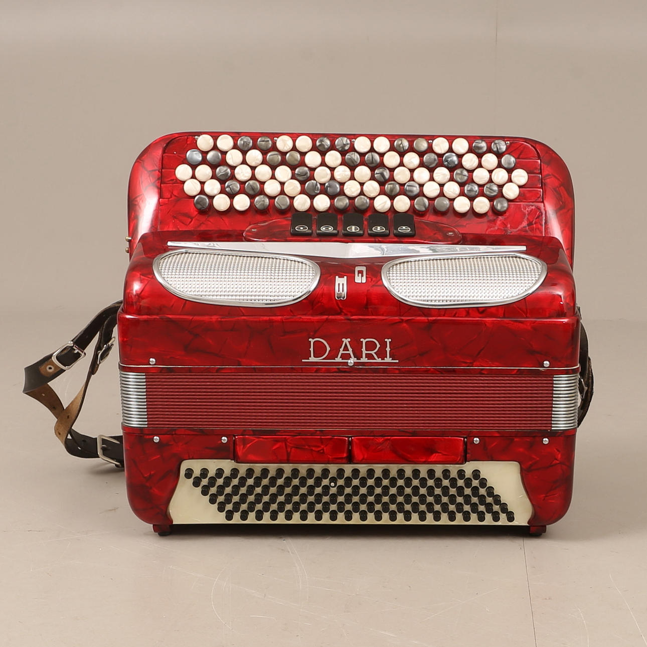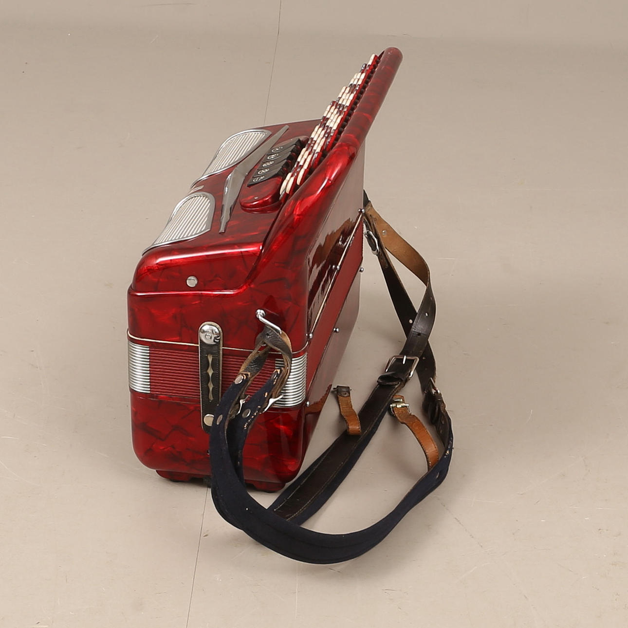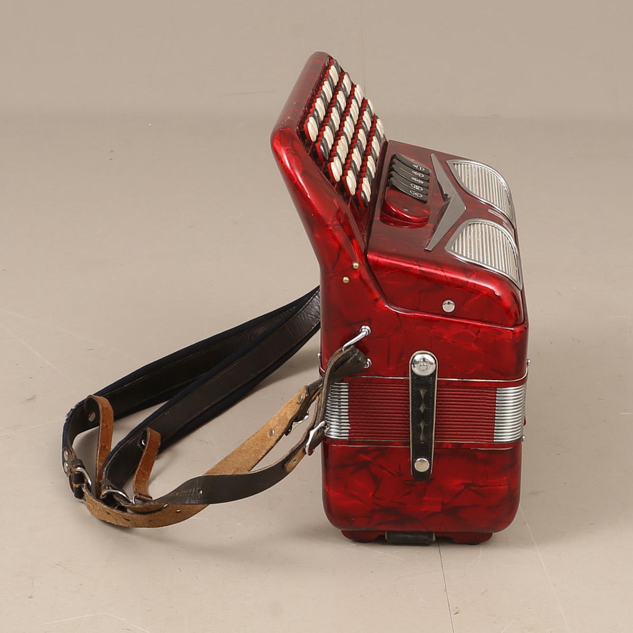 Cirka 42 x 40 cm. Väska medföljer. Knappdragspel.