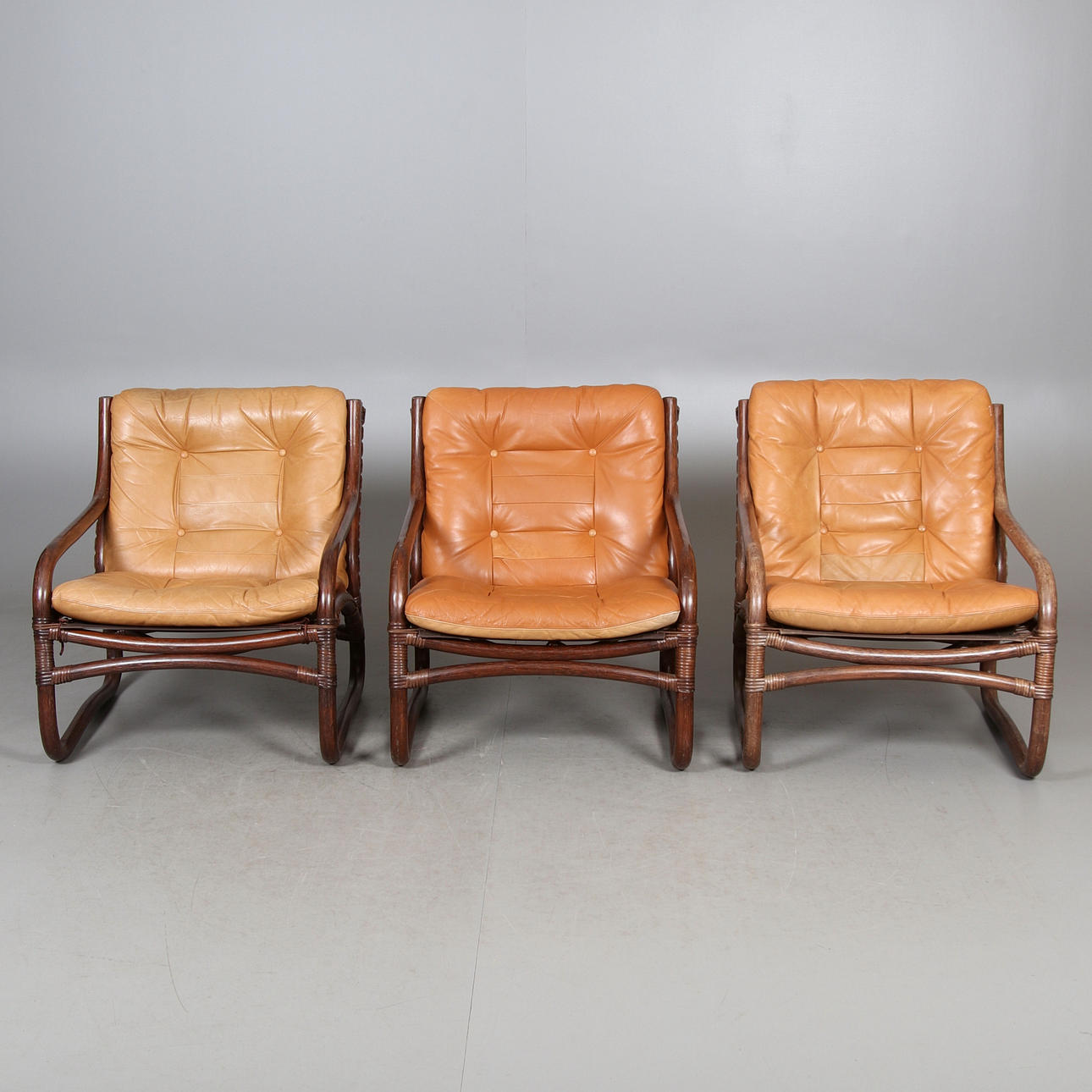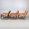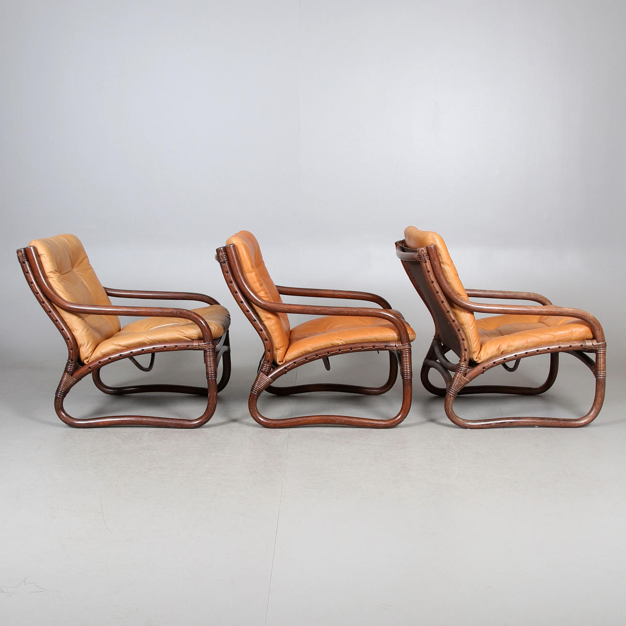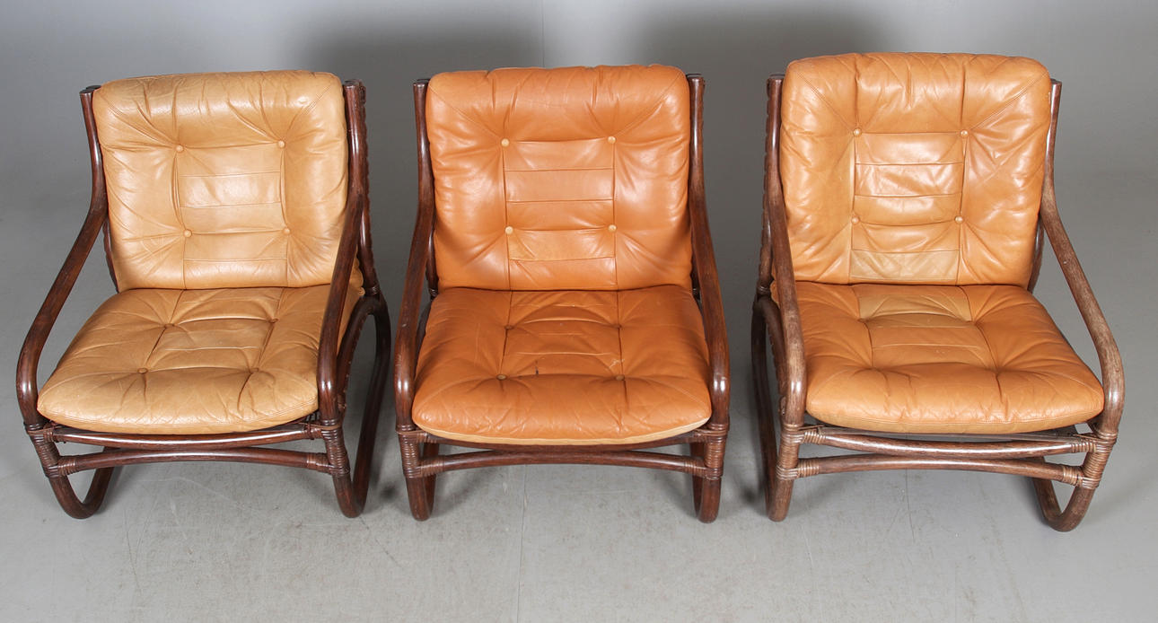 Lösa dynor klädda i ljusbrunt skinn, stomme av betsad bambu. Undersits och rygg i bärande väv med snörning.