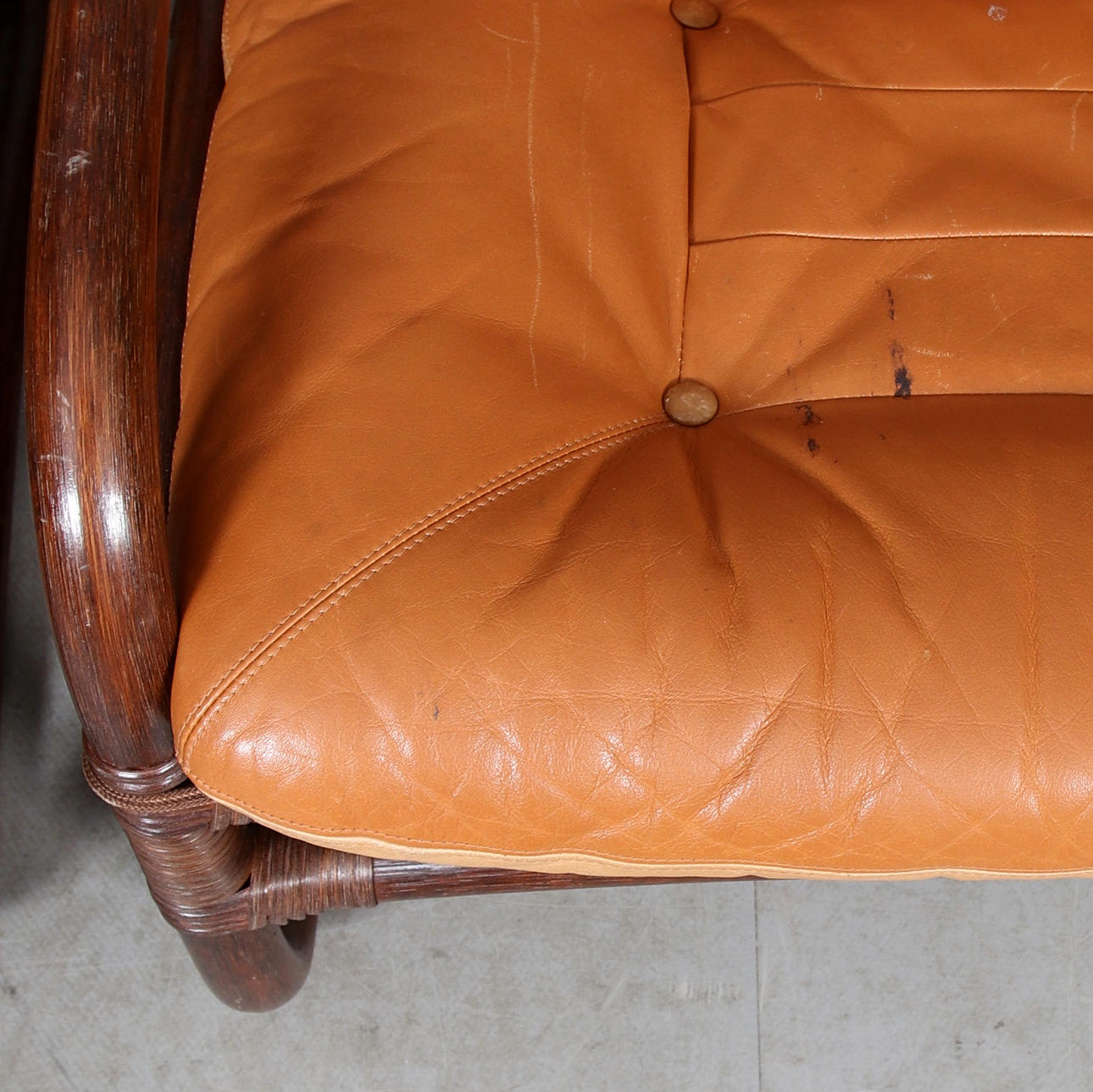 Bruksslitage, märken, fläckar. En fåtölj med ljusare skinnklädsel.