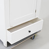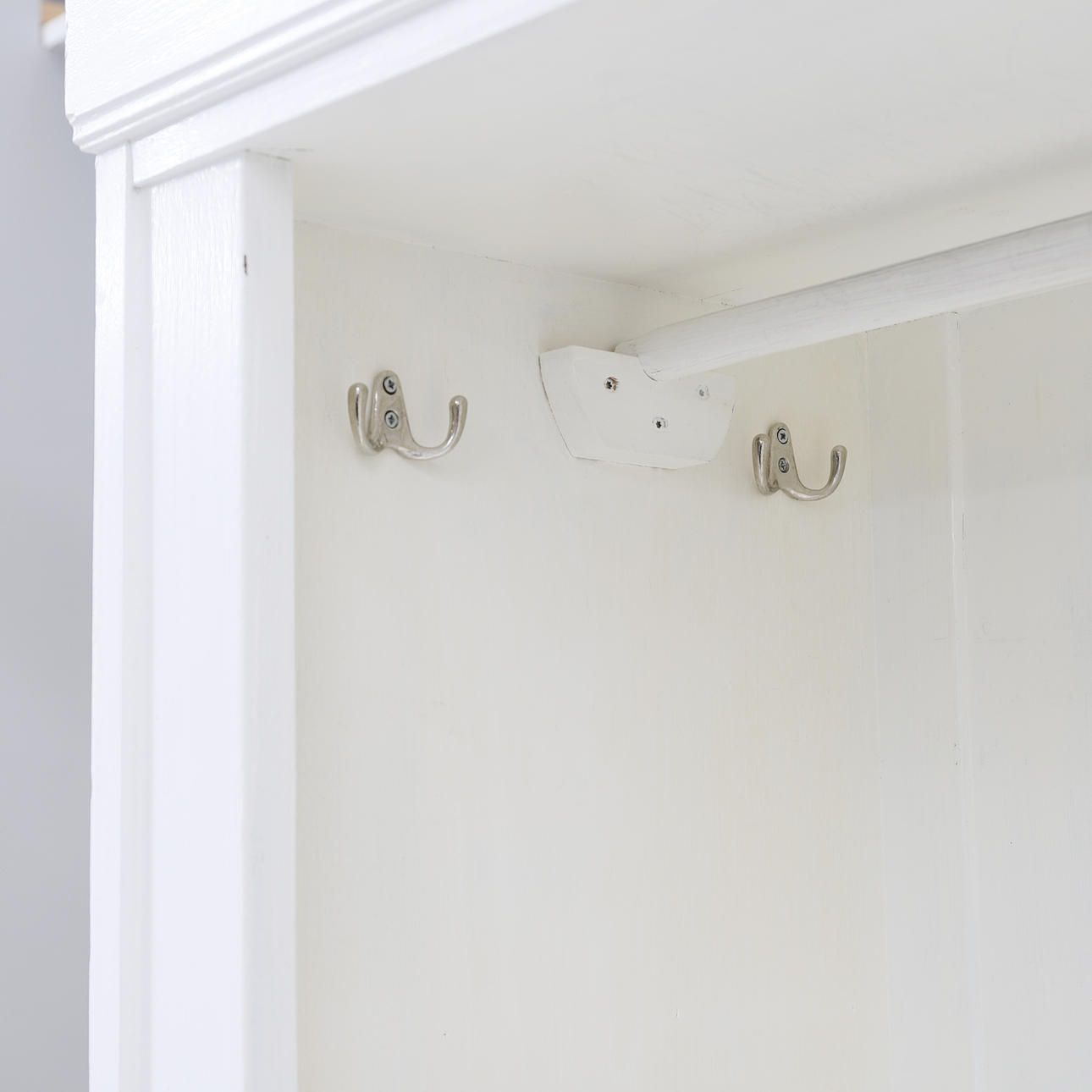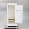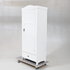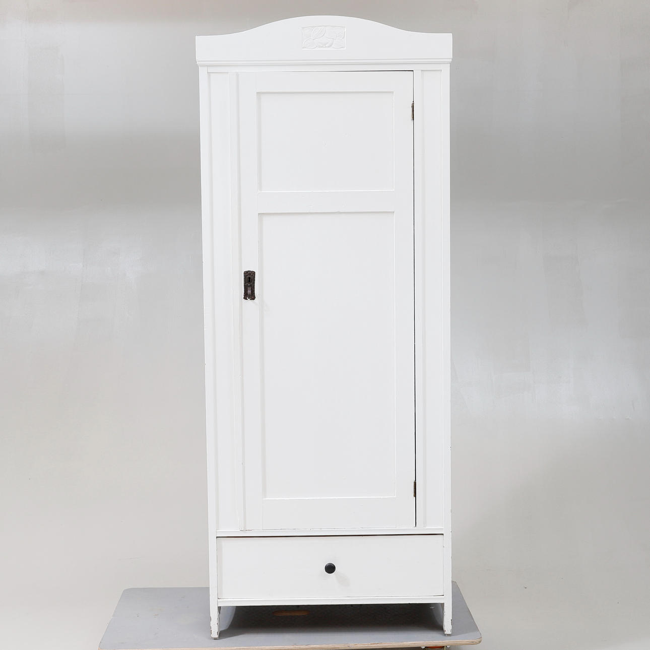 Vitmålad. Skuren dekor. En dörr med bakomliggande förvaring. En låda undertill. Längd ca 77 cm. Bredd 49 cm. Höjd 192 cm.