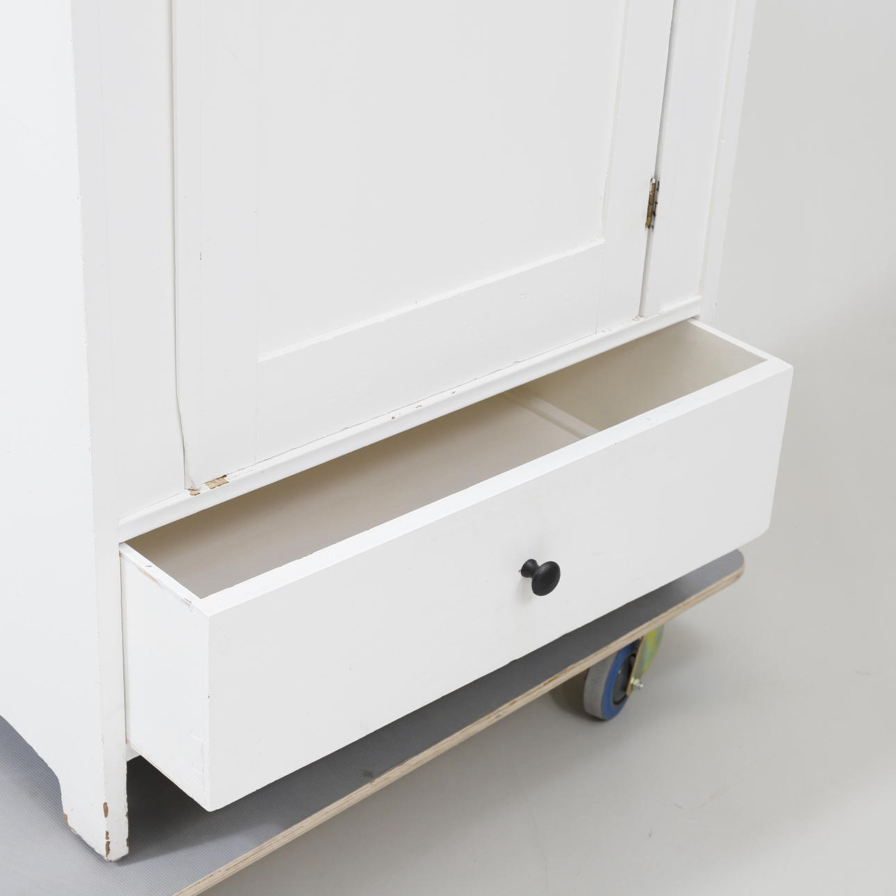 Bruksslitage. Färgbortfall. Mindre torrsprickor. Lådan saknar stoppkloss. Slagen dörr. Senare bemålning.
