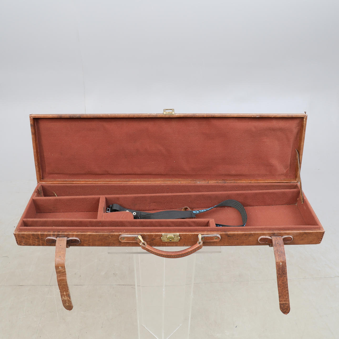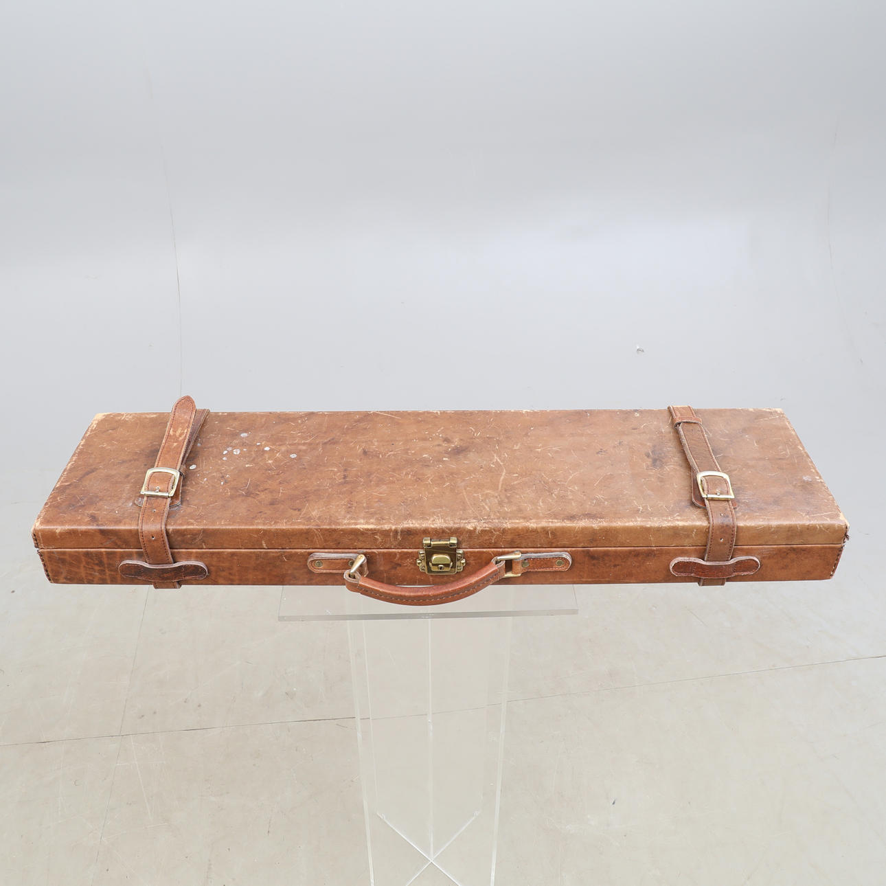 Koffert nr två är klädd i läder och inredd i brun filt för ett hagelgevär, en vapenrem medföljer.