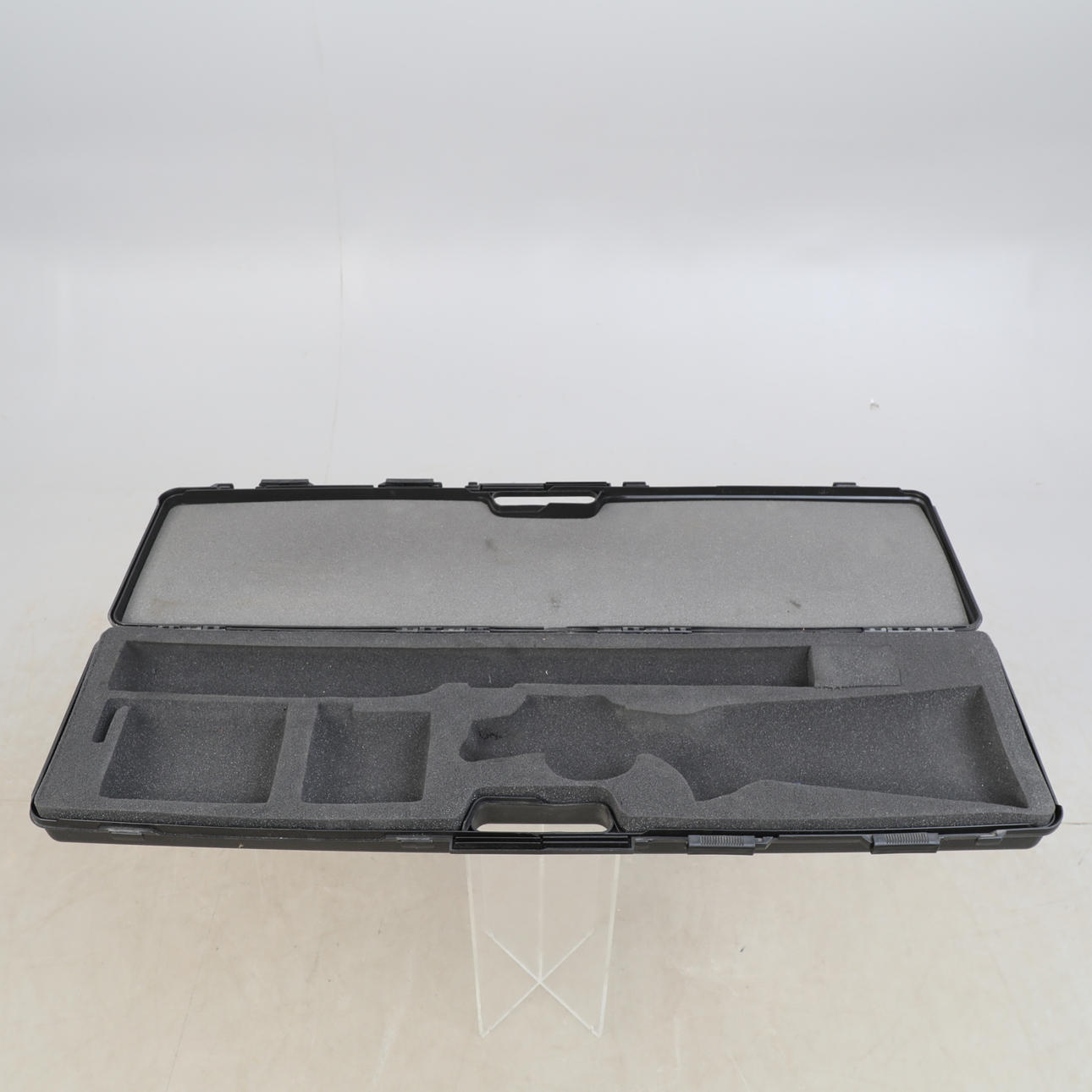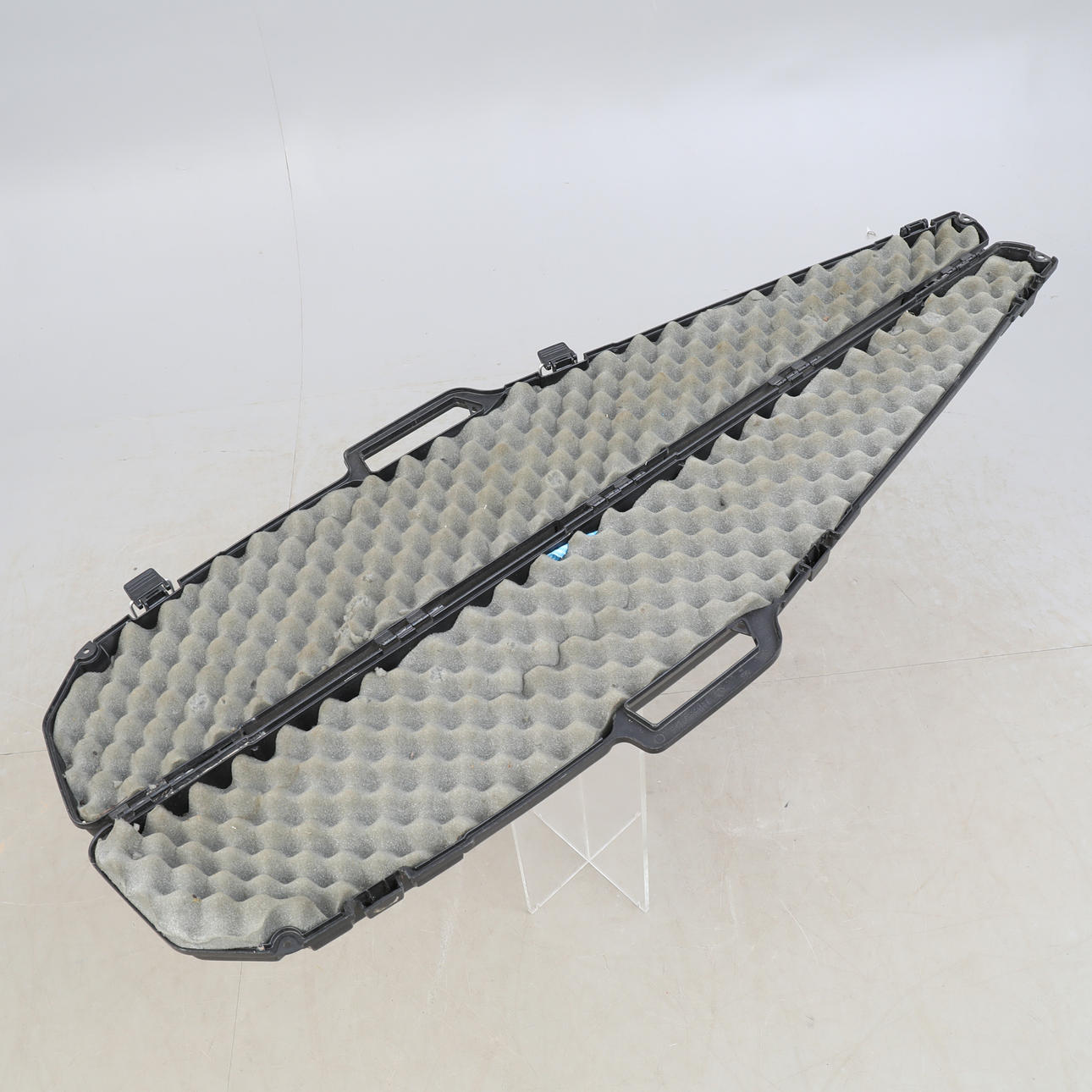 En gevärskoffert i kraftig svart plast med ingjutna naturmotiv, längd ca 133 cm, höjd ca 10 cm försedd med bärhandtag.