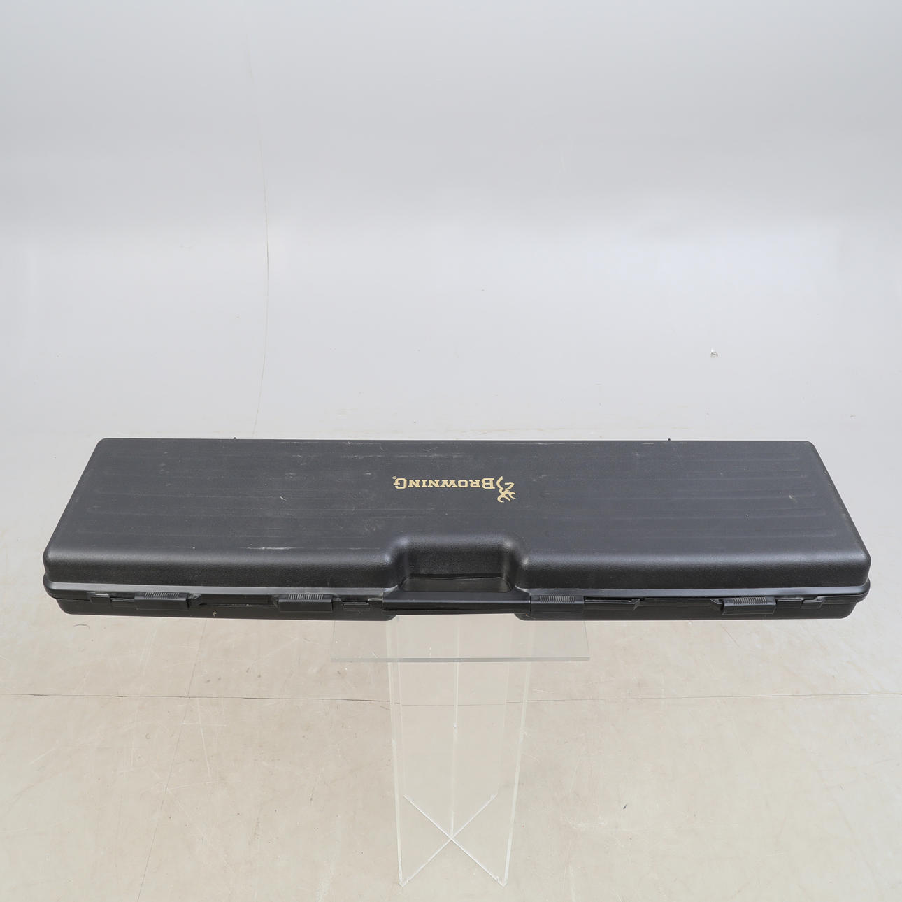 Koffert nr tre är också tillverkad i kraftig svart plast, inredd med skumgummi för ett hagelgevär och försedd med ett handtag samt Brownings logotype på locket.