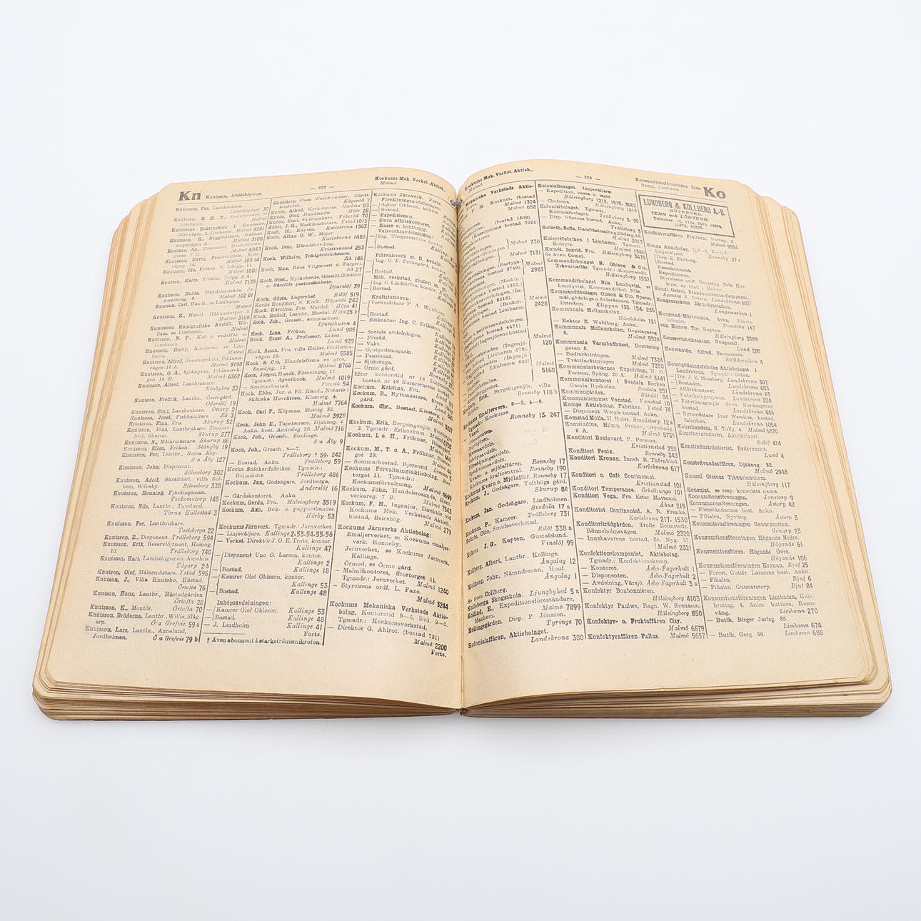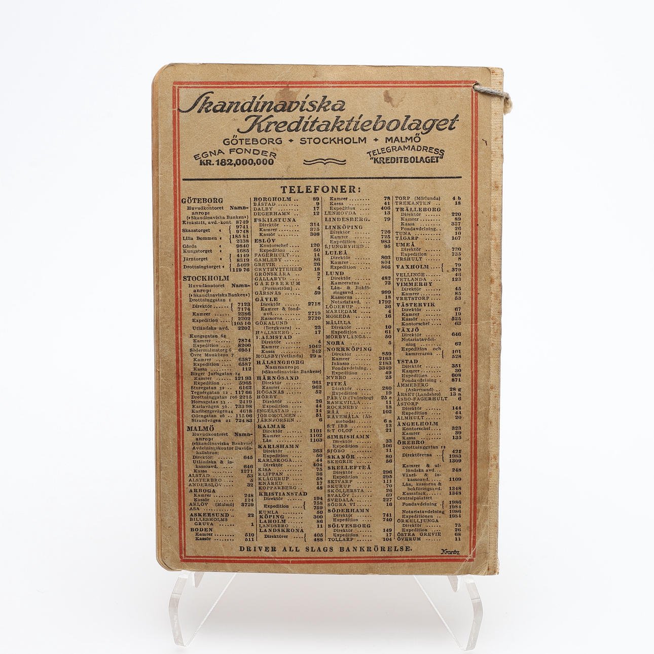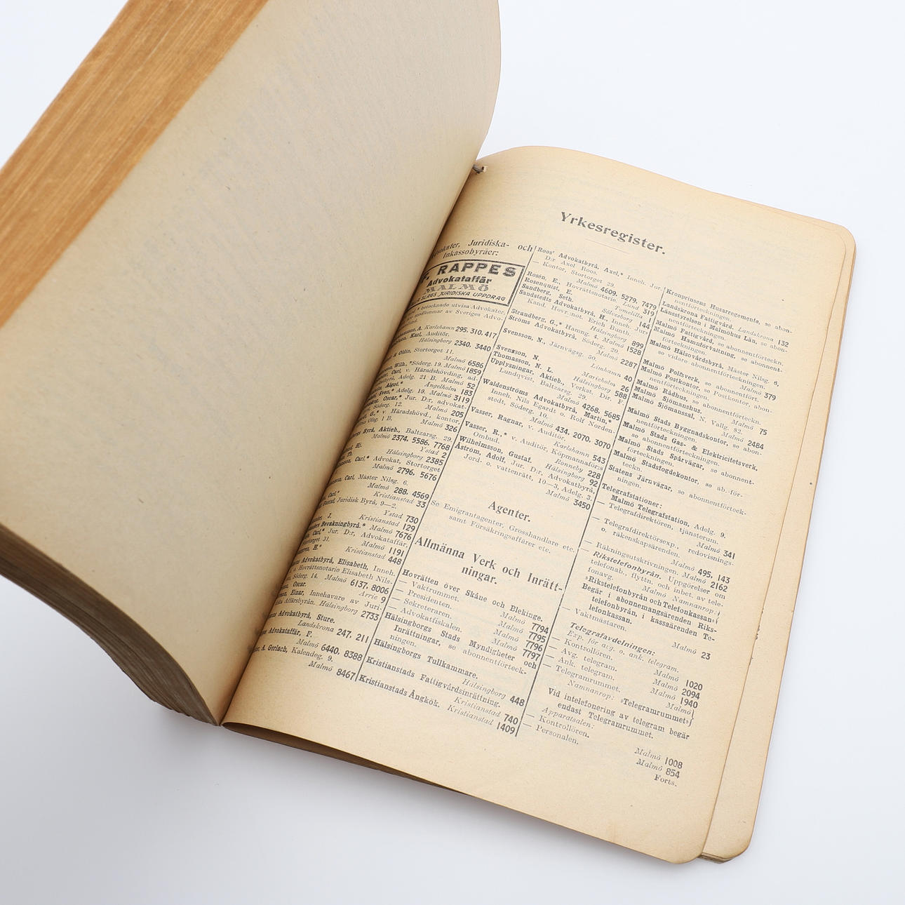 Rikstelefonkatalogen. Del. 1 Skåne och Blekinge 1923. Elanders Boktryckeri AB, Göteborg, 1928. Stor häftad 8vo med tryckta omslag. 580 sid. , (II).