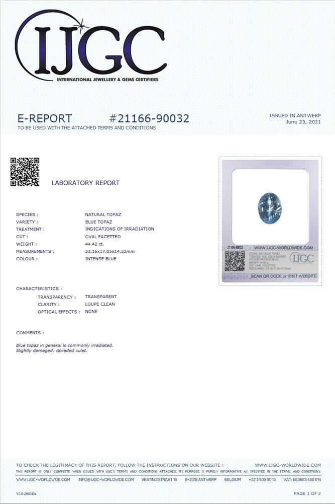 44.42ct Blue Topaz, certifierad av IJGC, Belgien/Antwerpen.