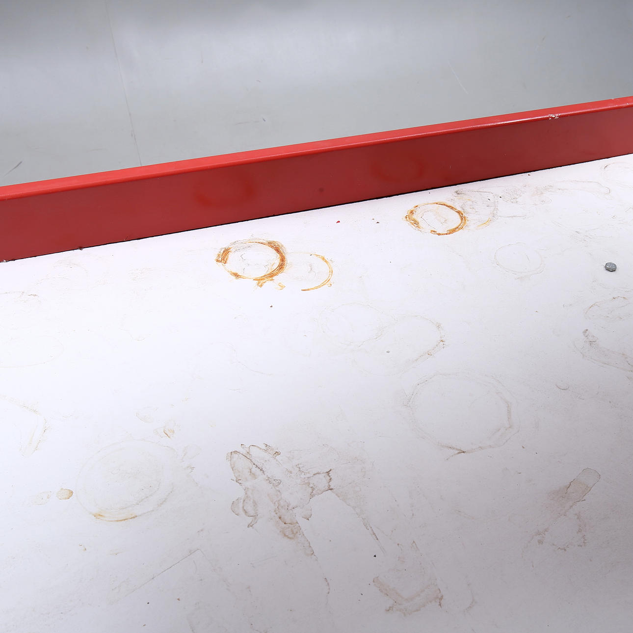 Stomme av lackerad metall, hyllplan av trä och masonit.