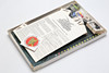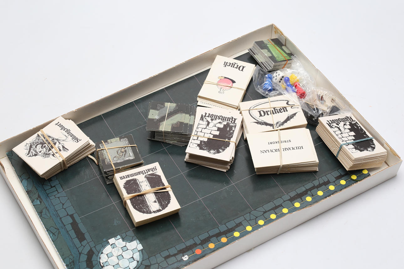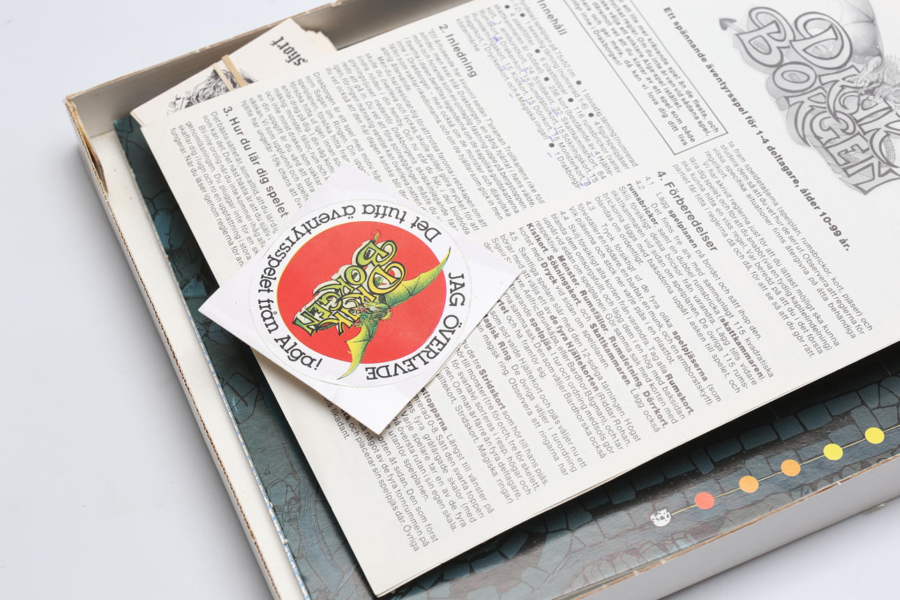 Tärningar, spelkort, pjäser, bruksanvisning, bräde, klistermärke.