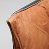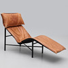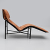 Svart metallstomme, sits i ljusbrunt läder. Längd c:a 160, total höjd c:a 95 cm.