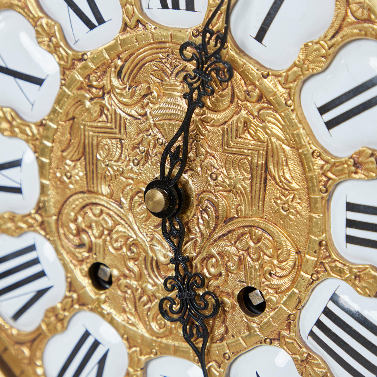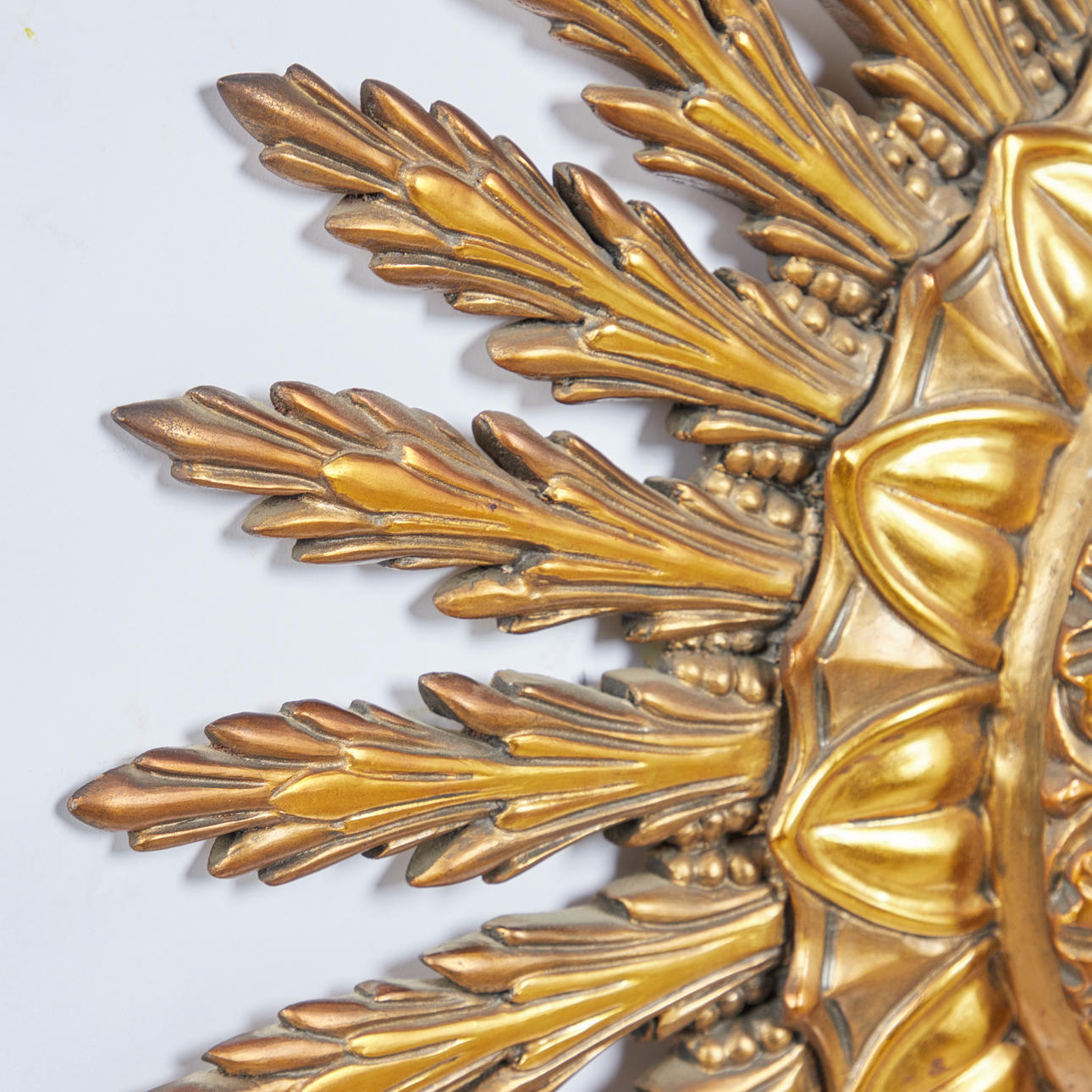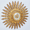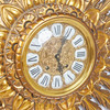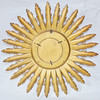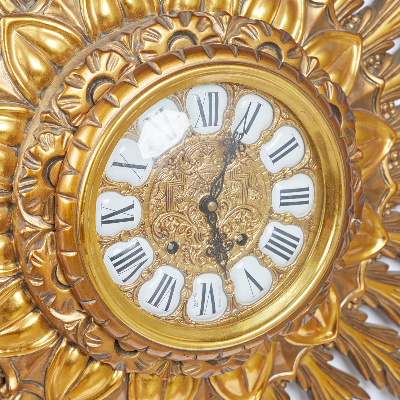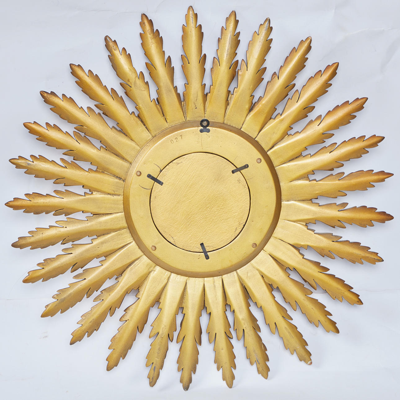 Väggklocka/klocka, trä, glas, metall. Väggklocka med en strålande träram, guldfärgad trimmad, och en guldfärgad, lättnad urtavla med romerska siffror på en vit metall bakgrund, minut- och sekundvisare av svart metall, med en gångjärn glasfaner, d.70cm, d.10cm.