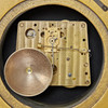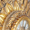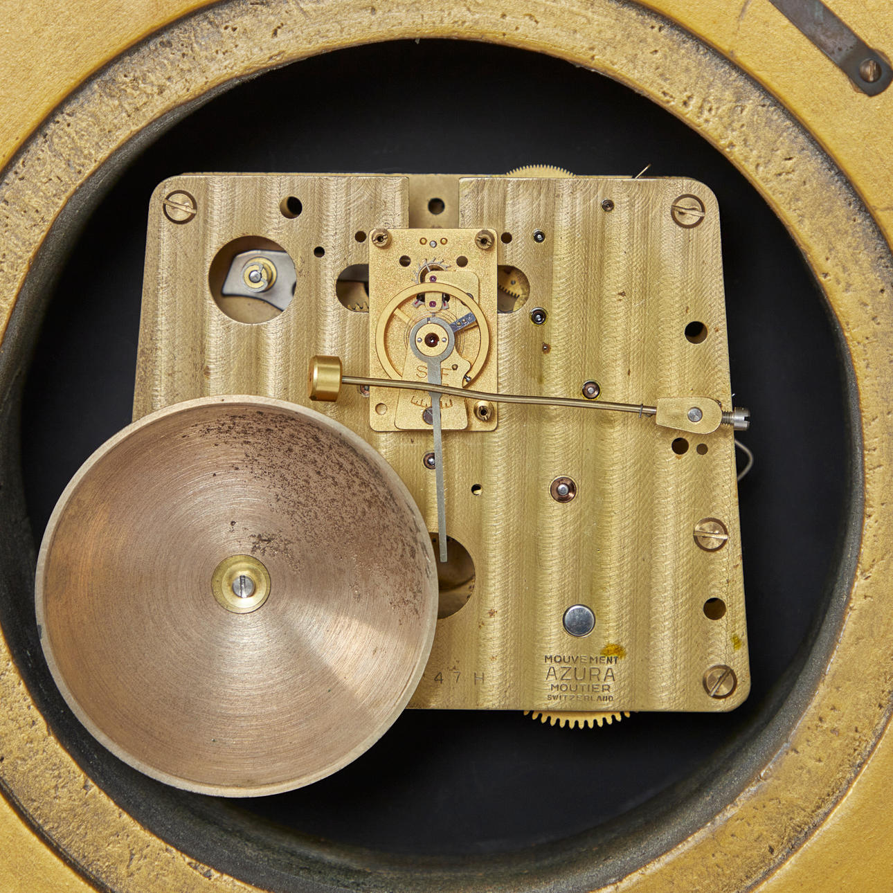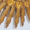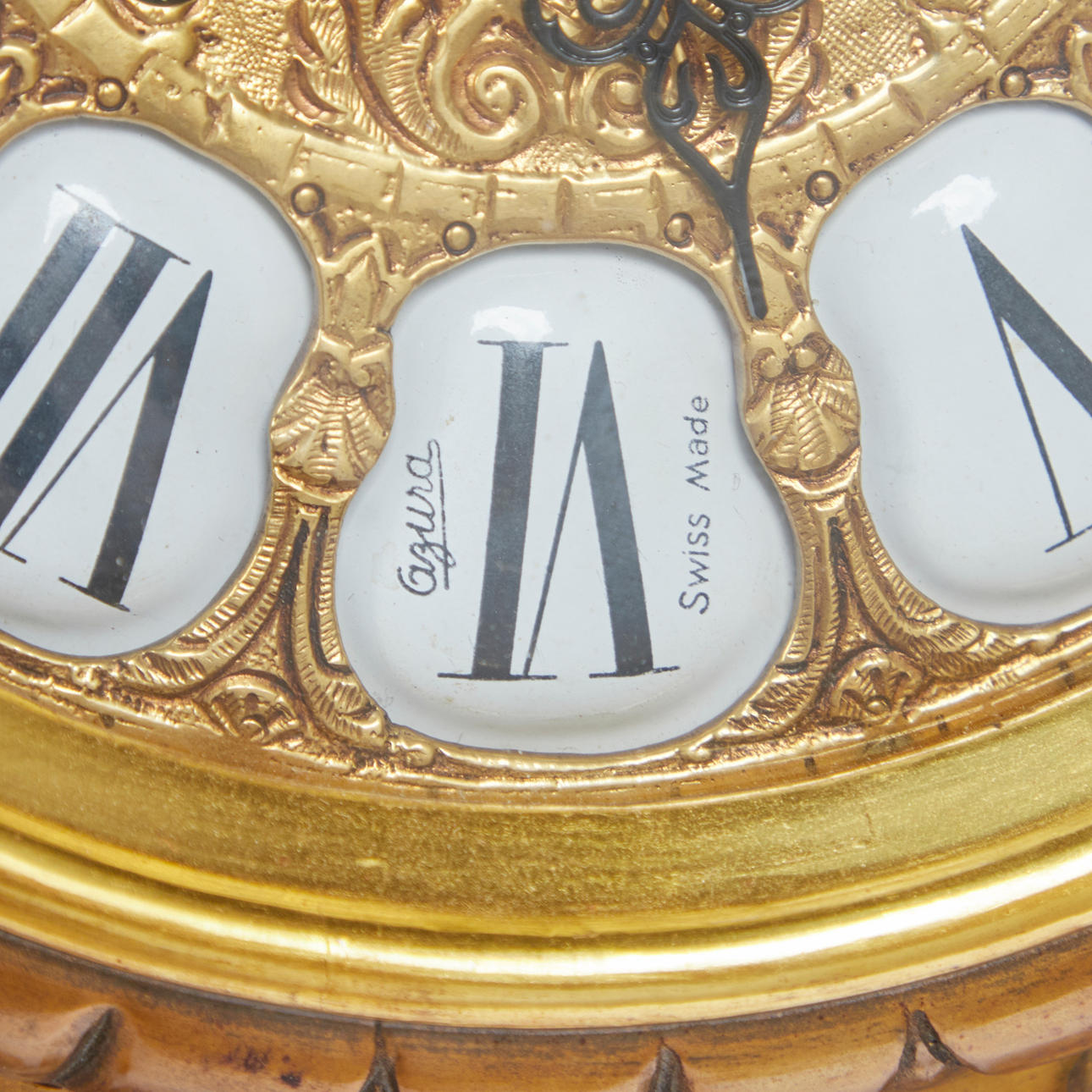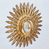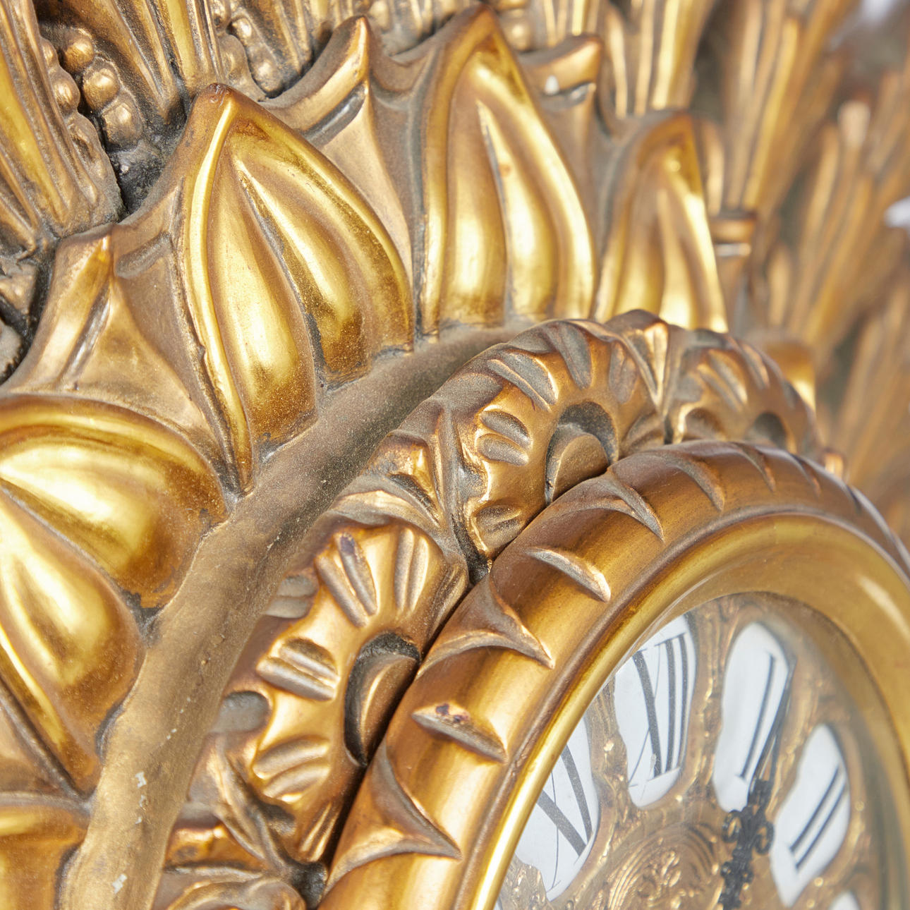 Väggklocka/klocka, trä, glas, metall. Väggklocka med en strålande träram, guldfärgad trimmad, och en guldfärgad, lättnad urtavla med romerska siffror på en vit metall bakgrund, minut- och sekundvisare av svart metall, med en gångjärn glasfaner, d.70cm, d.10cm.