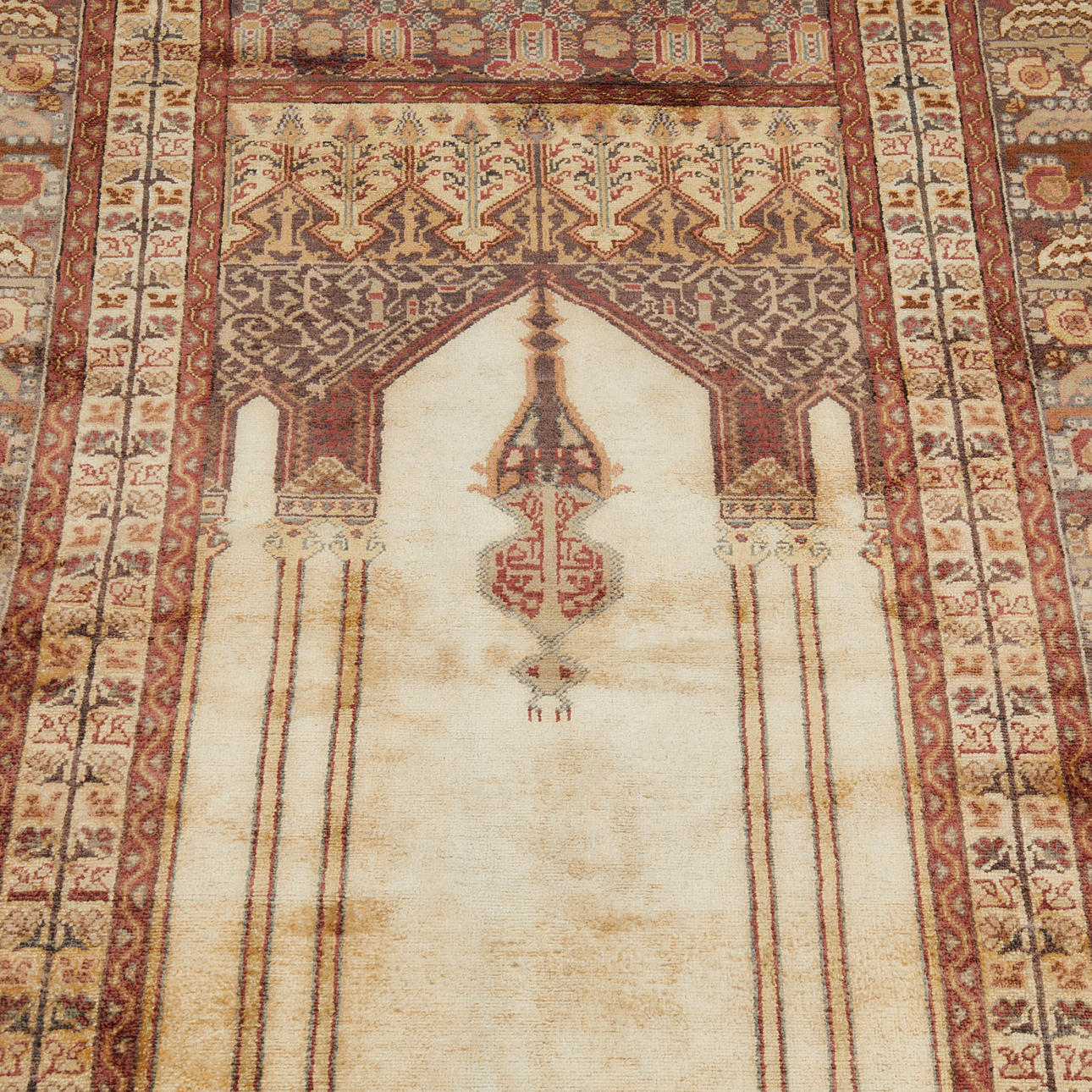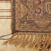 solblekt, upphängningsanordning monterad på mattan, gulnade fransar.