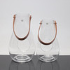 Klarglas, lock av metall och hänge av läder. Höjd ca 25-30 cm.