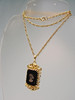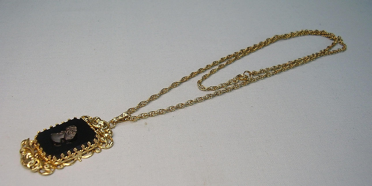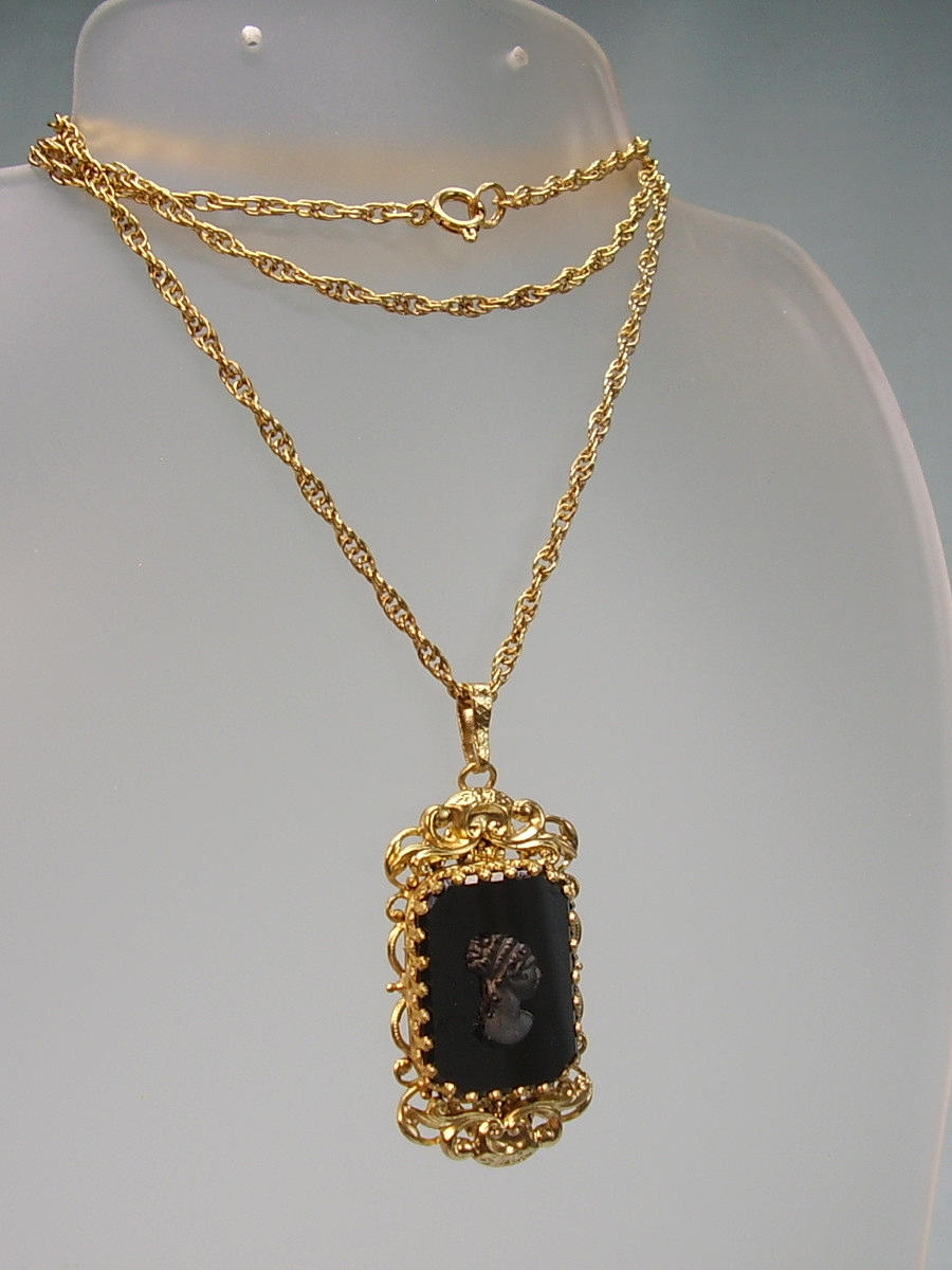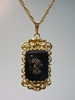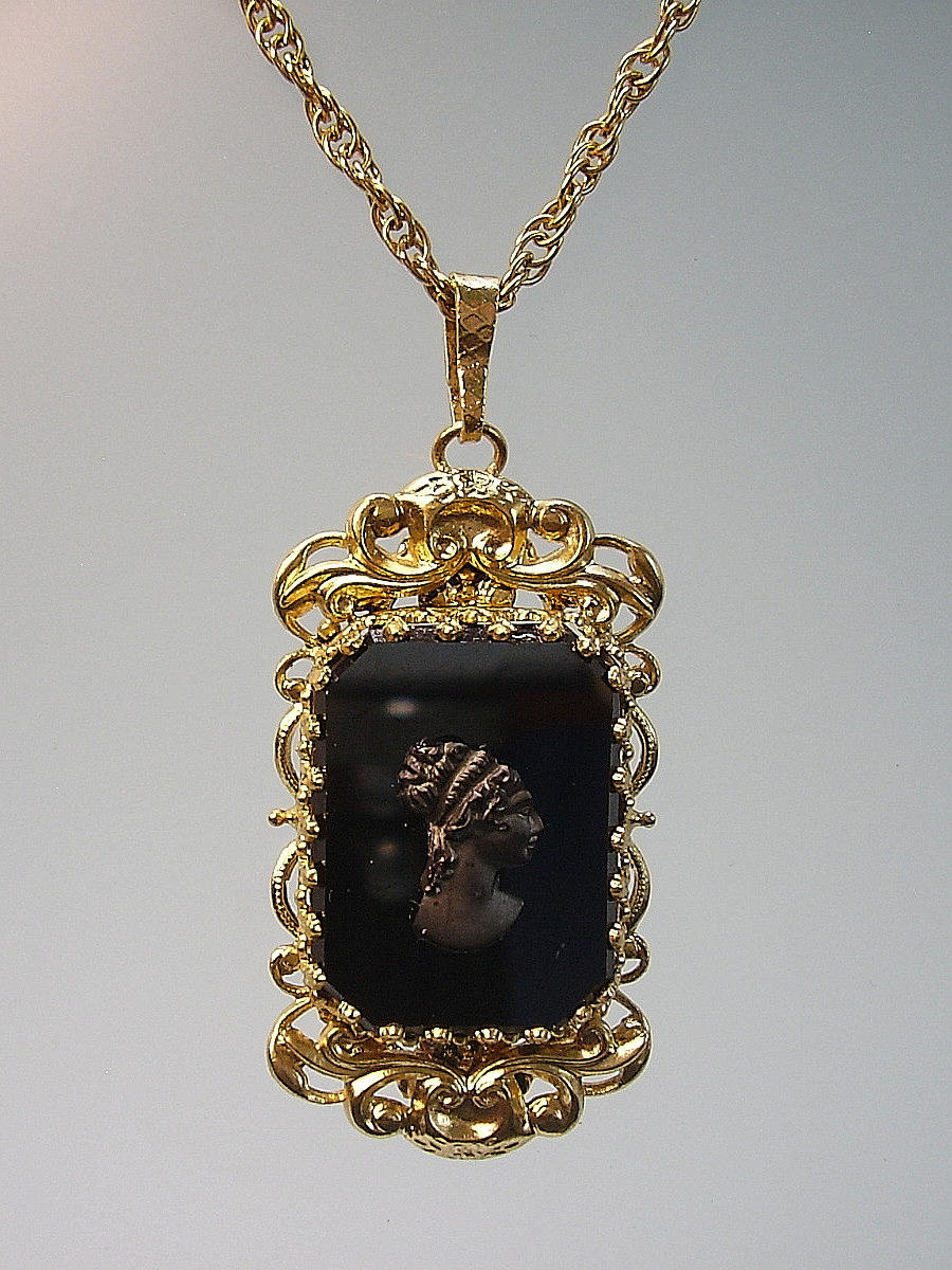 De antika mode smycken från Gablonec är gjorda i guld doublé. Hänget är dekorerat med en onyxplatta, som bär ett porträtt av en Biedermeier-dam.