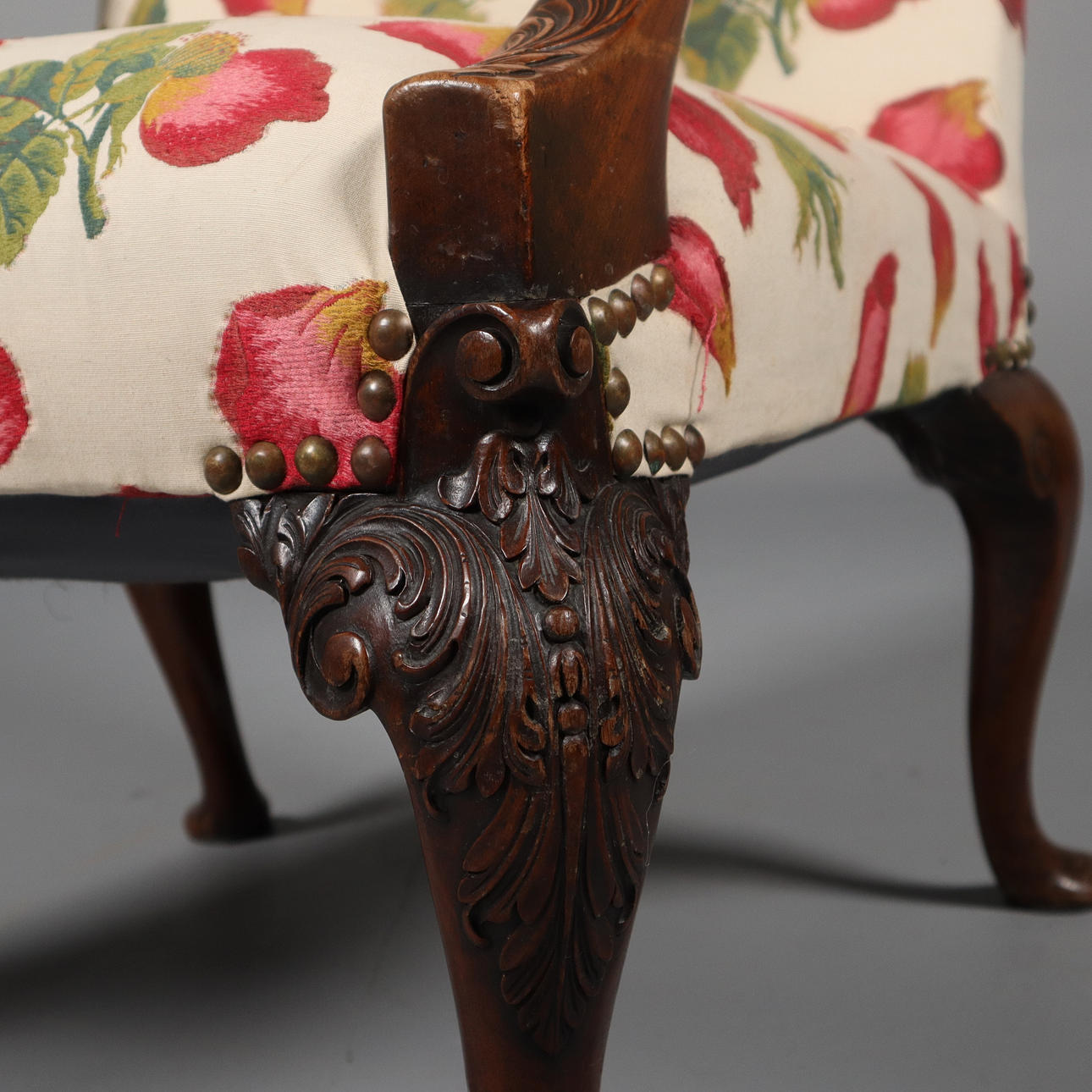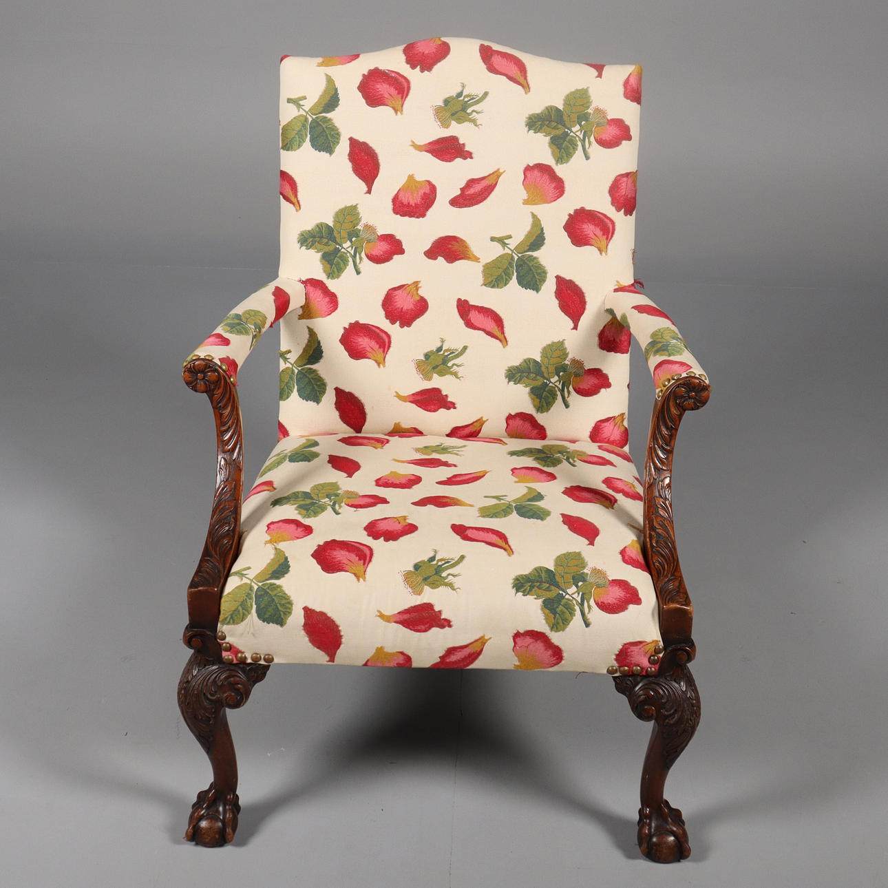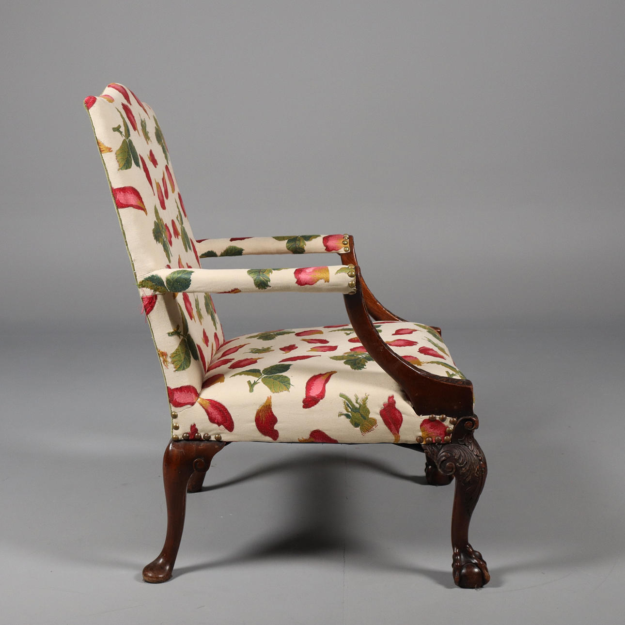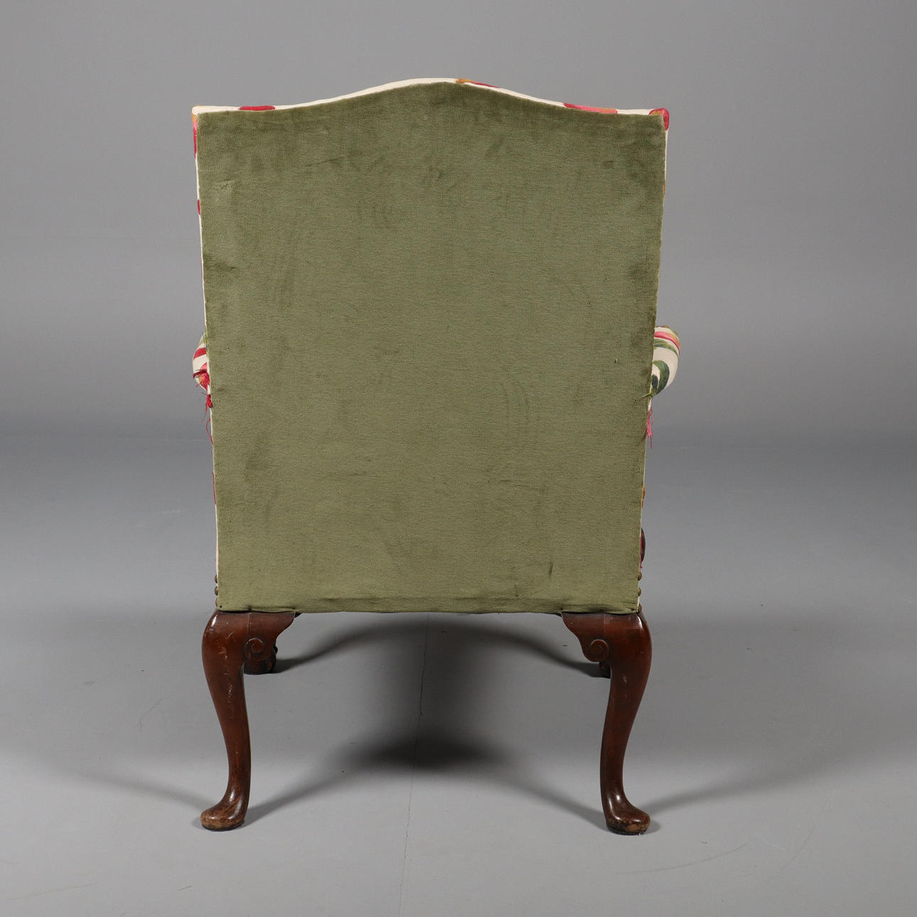 Höjd 107 cm, sitthöjd 46 cm, bredd 79 cm, djup 80 cm. Senare tapetserad.