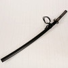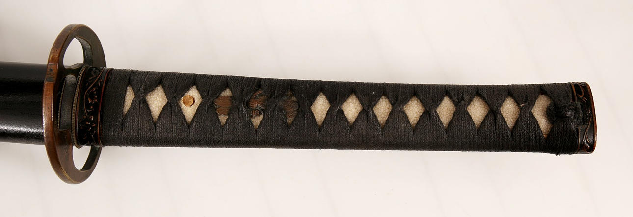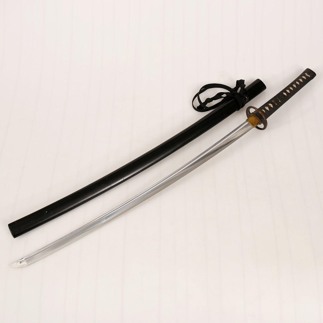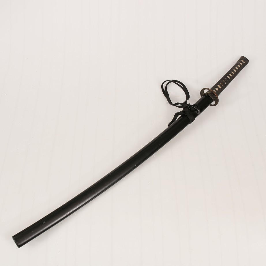 Träningssvärd av japansk modell. Balja av svartmålat trä. Skinnklätt handtag med brons och mässingdetaljer. Ej skarpslipad klinga.