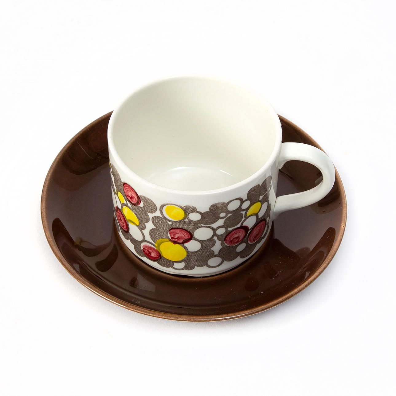 Kaffekopp med fat. Diameter kopp 7cm, höjd 6,5 cm. Diameter fat 14 cm.