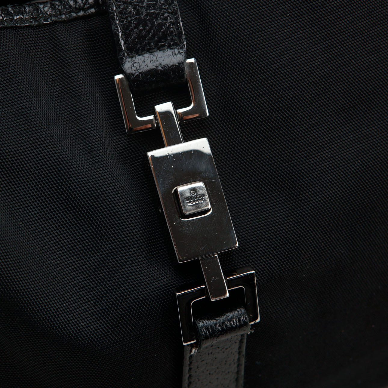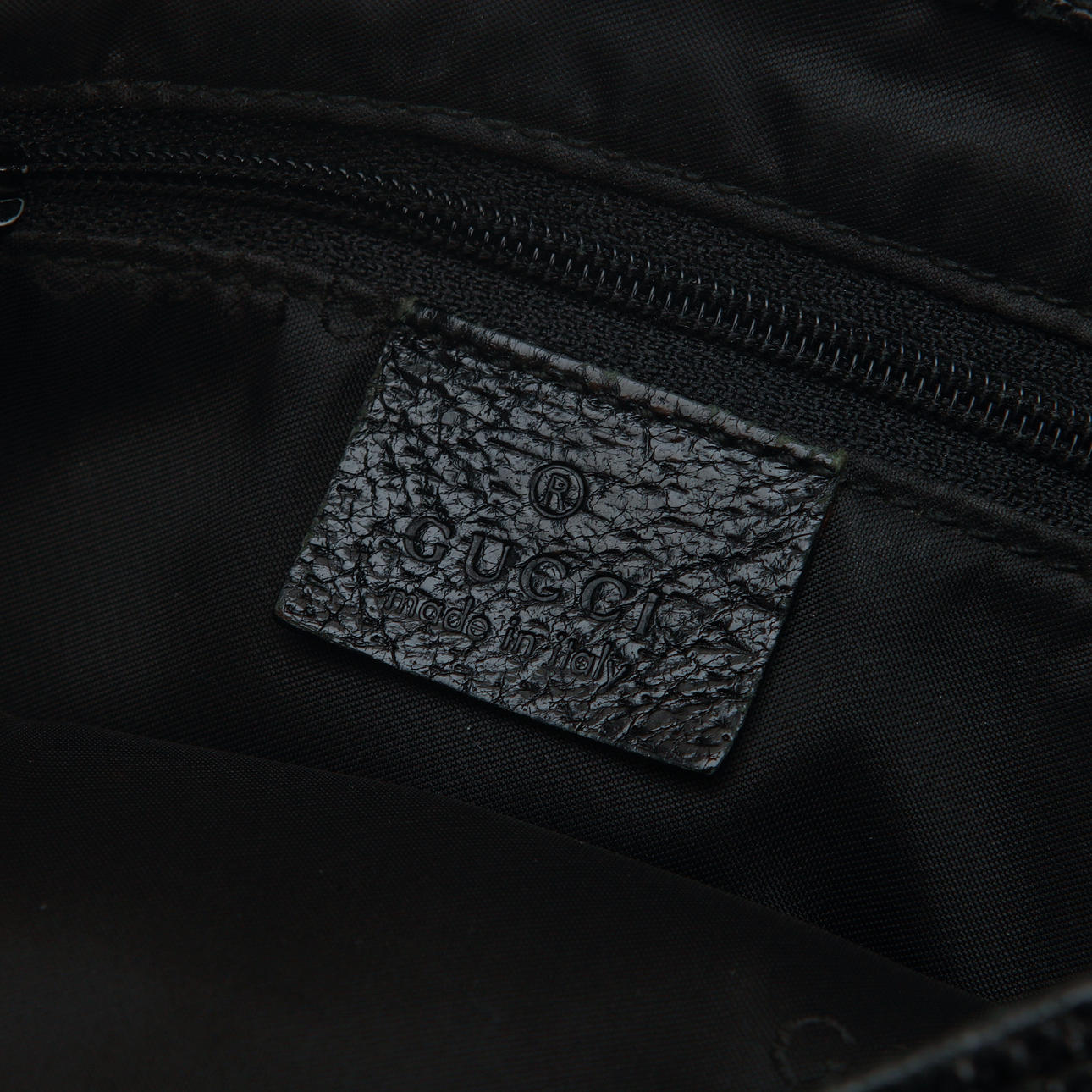 Väska i svart tyg med detaljer i svart skinn. Ca 22 x 33 x 3 cm. Ett innerfack med dragkedja. Märkt Gucci made in italy. Nummer 001-3306 002058.