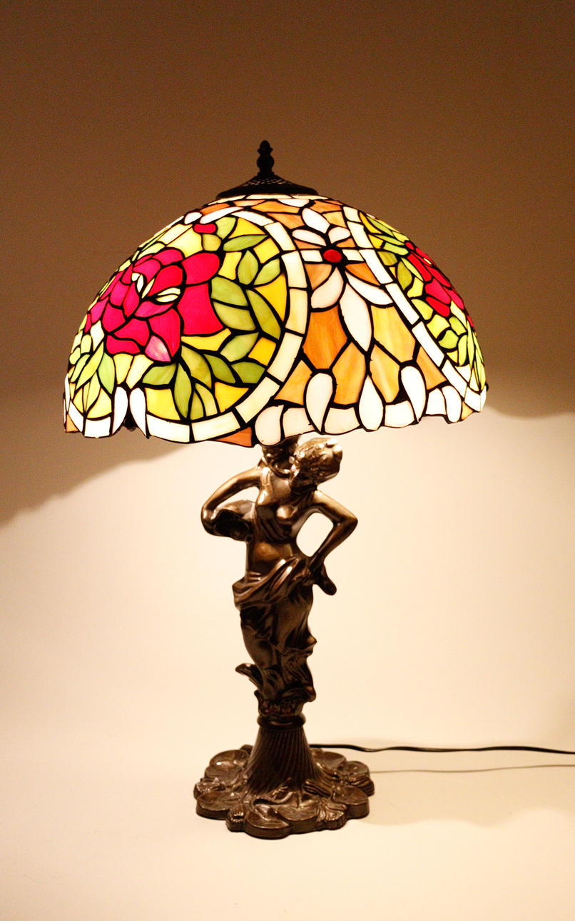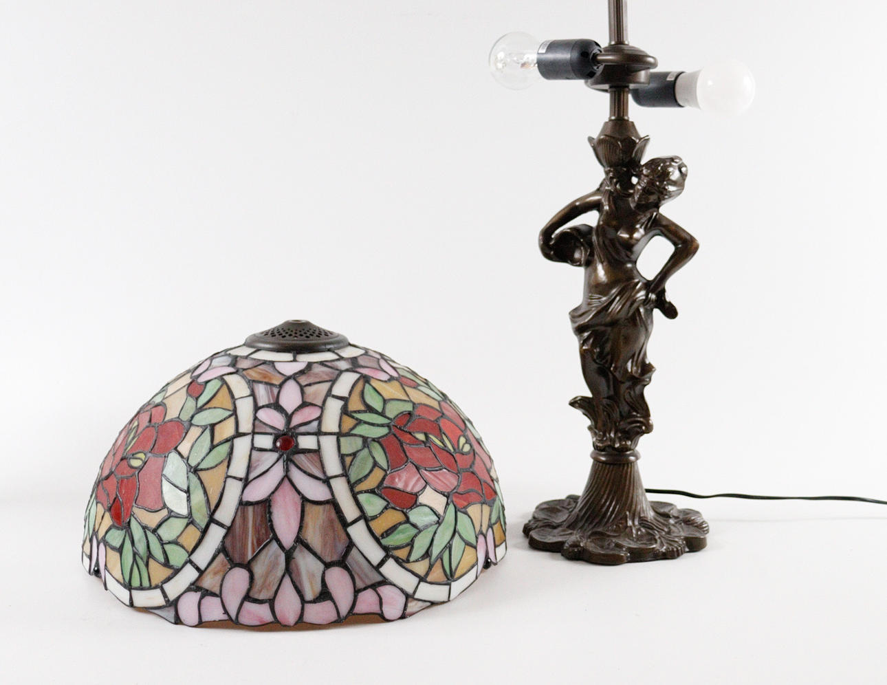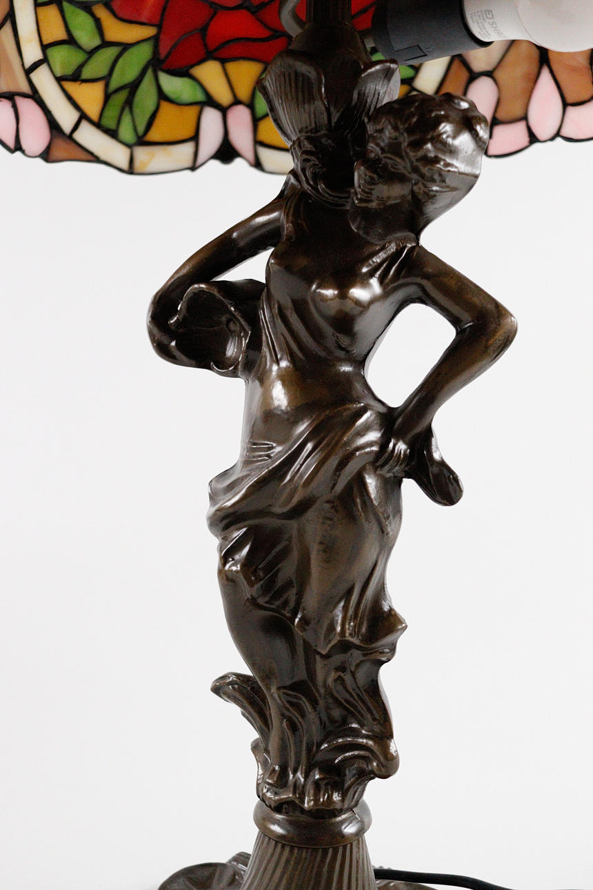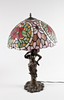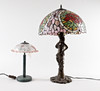 2 lampor/bordslampor i Tiffany-stil, plastkonstruktion, delvis gjord av glas, Mått ca.: h. 35/68 cm, diameter 25/41 cm.