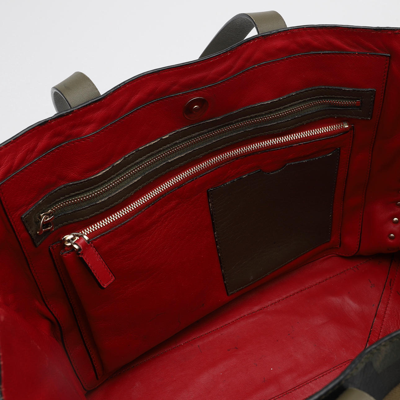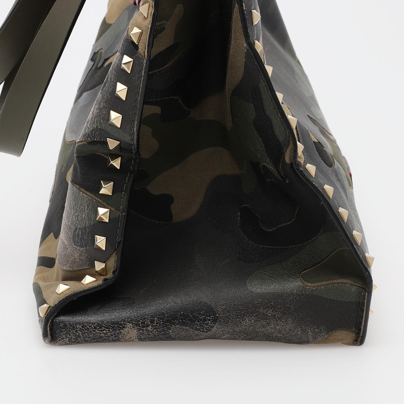 Kalvskinn och textil, kamouflage-mönstrad, invändigt röd med sex fickor. Medföljer dustbag.