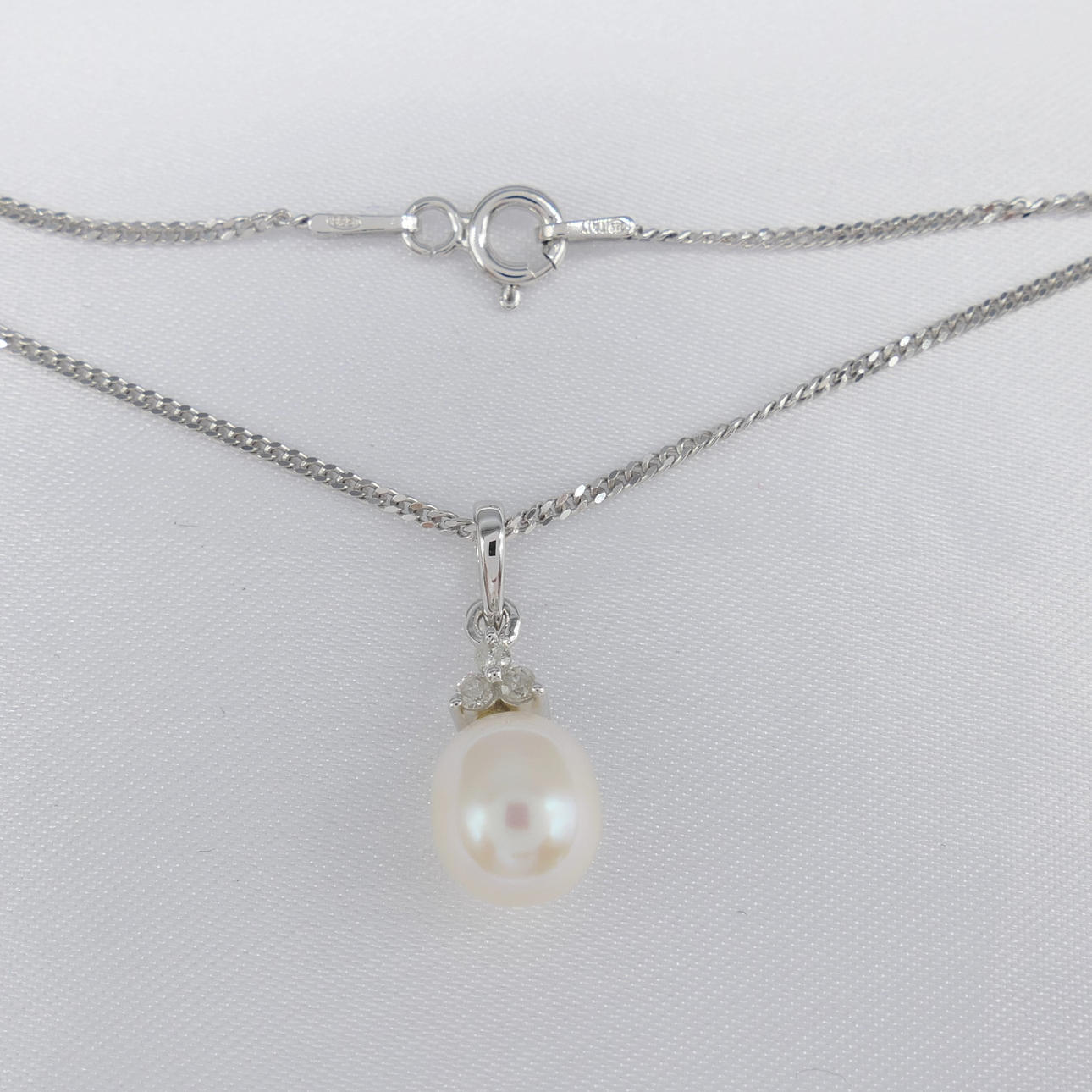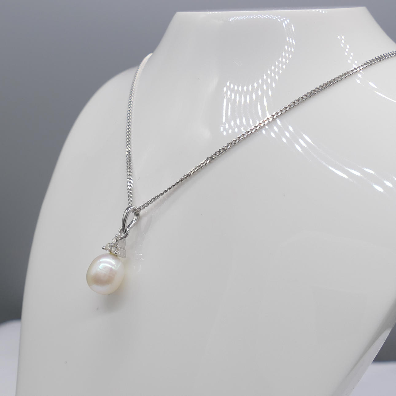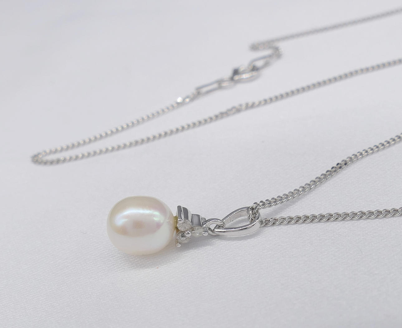 Ett 9k vitguld hänge med en oval odlad pärla och 3 diamanter på en silverkedja.