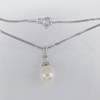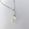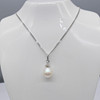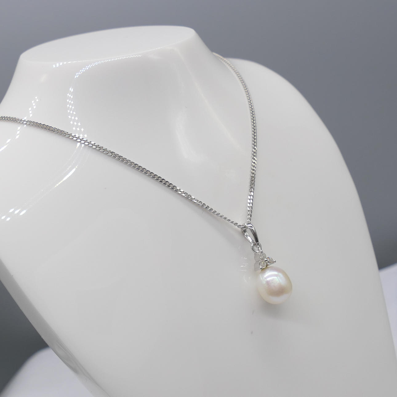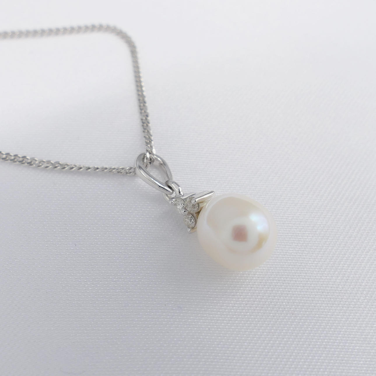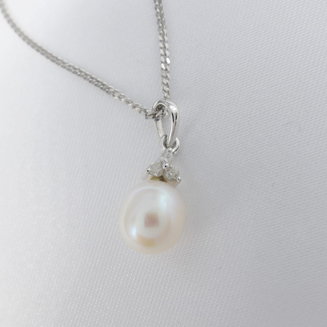 Ett 9k vitguld hänge med en oval odlad pärla och 3 diamanter på en silverkedja.
