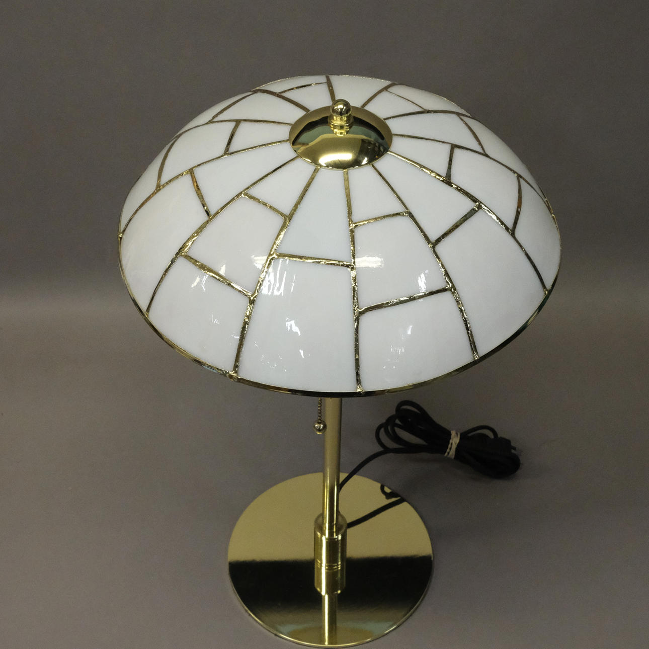 Tiffany-stil, mässing och glas. Höjd 54cm.