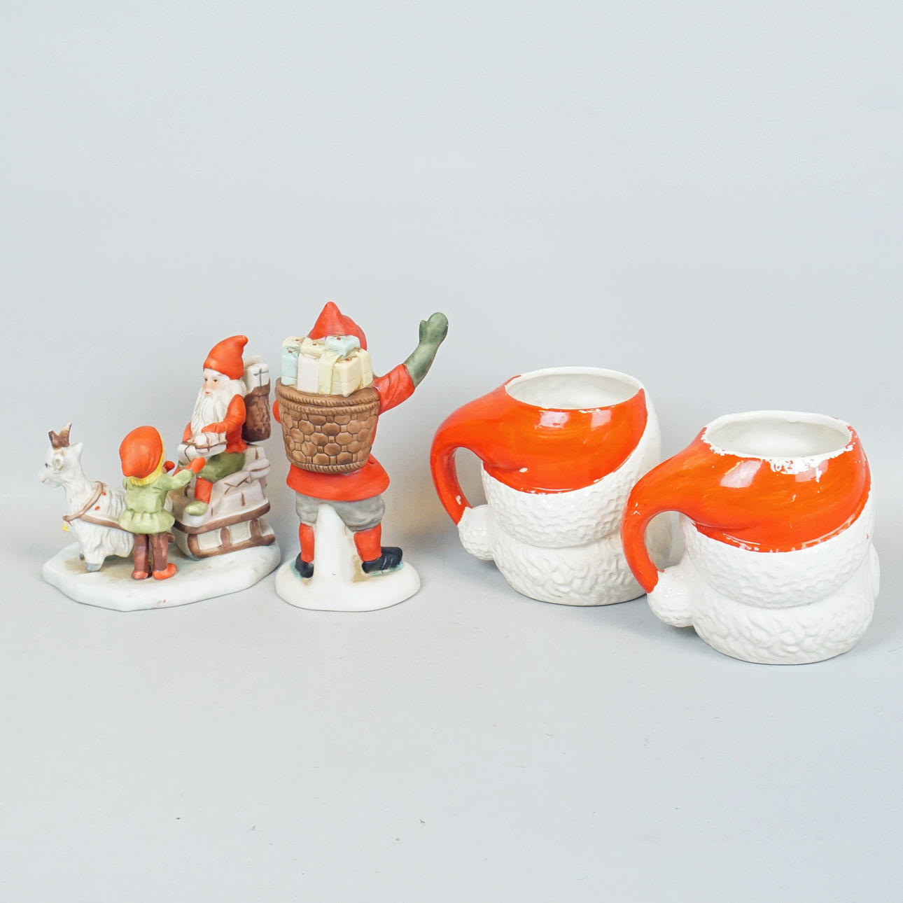 2 st tomtemuggar, höjd 10,5 cm 1 st figurin tomte med paket, Knalle Gården, höjd 15 cm 1 st figurin tomte på kälke efter get, ej märkt, höjd 11,5 cm.