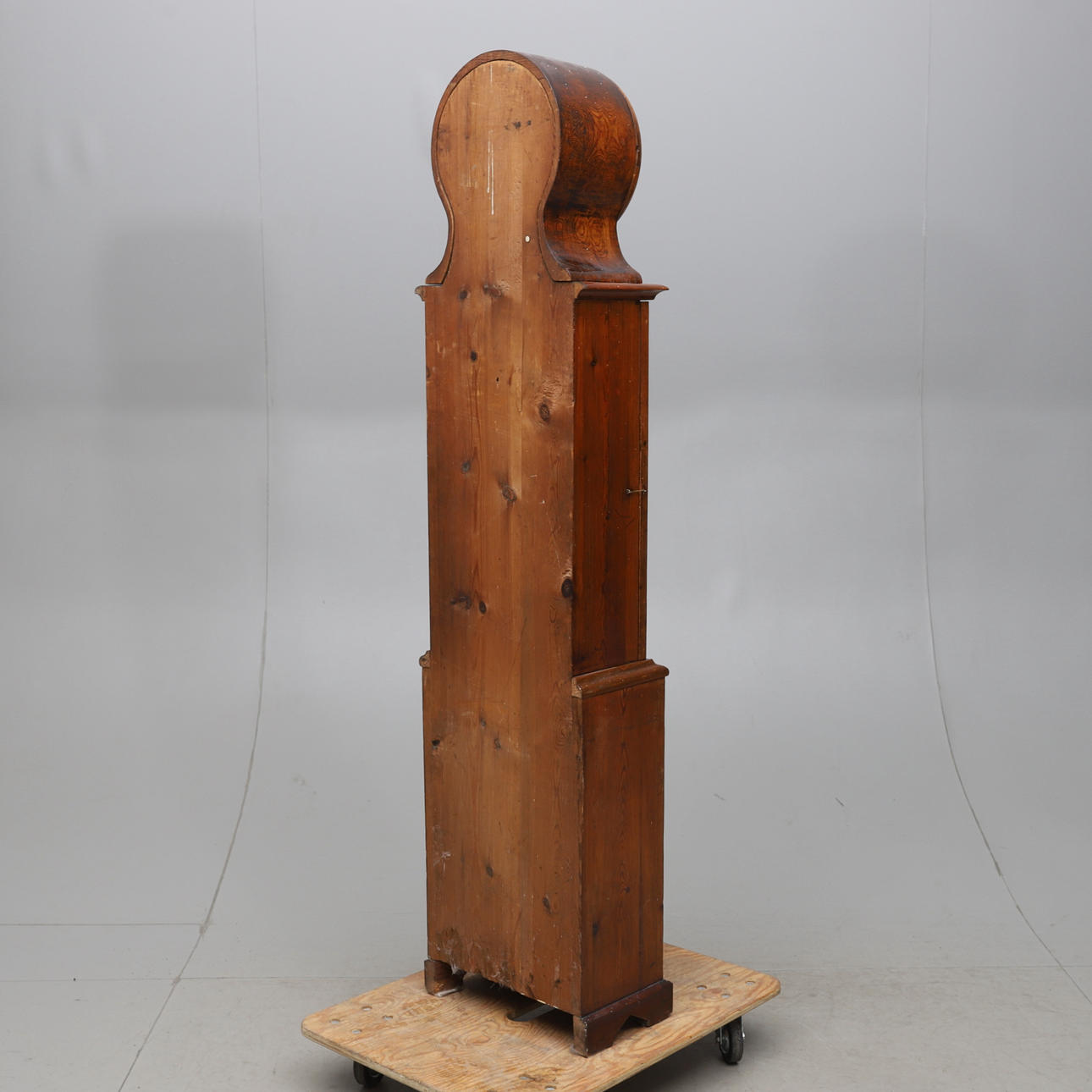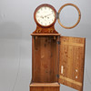 Fodral av furu, rak form, lös huv med glasad lucka, urtavla med arabiska siffror, märkt "A A L Mora". Urverk, pendel, lod samt uppdragsvev.