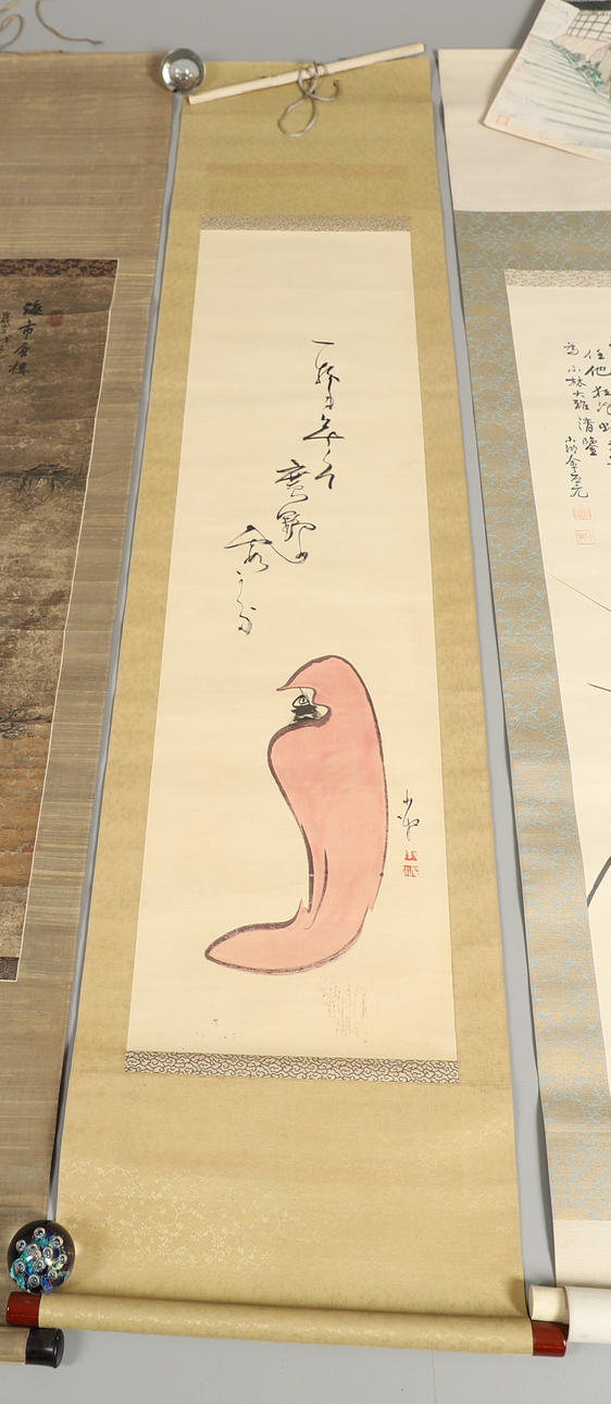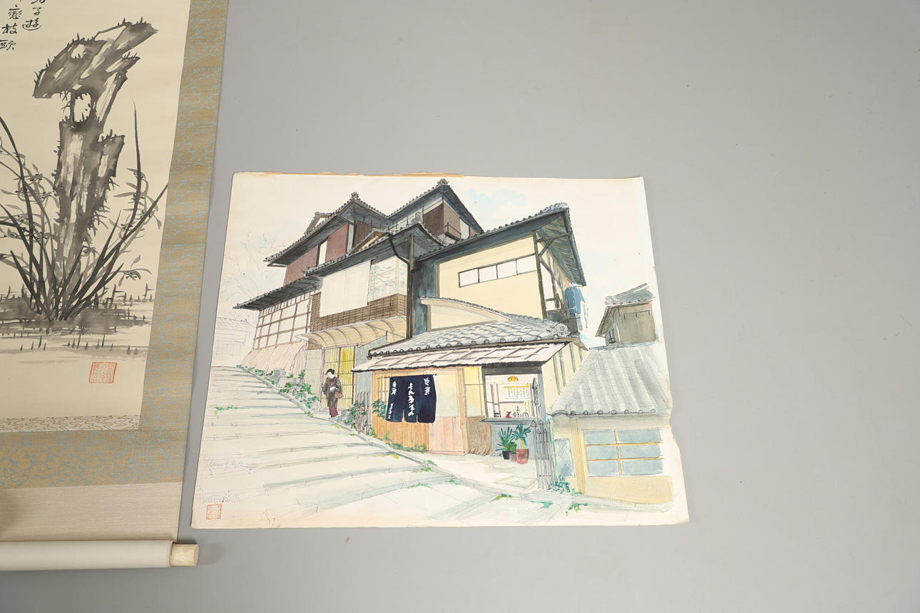 inklusive en illustrerande figurer i ett landskap, tillsammans med en japansk oramad akvarell och tuschgatuscen, signerad, 57cm x 66cm.