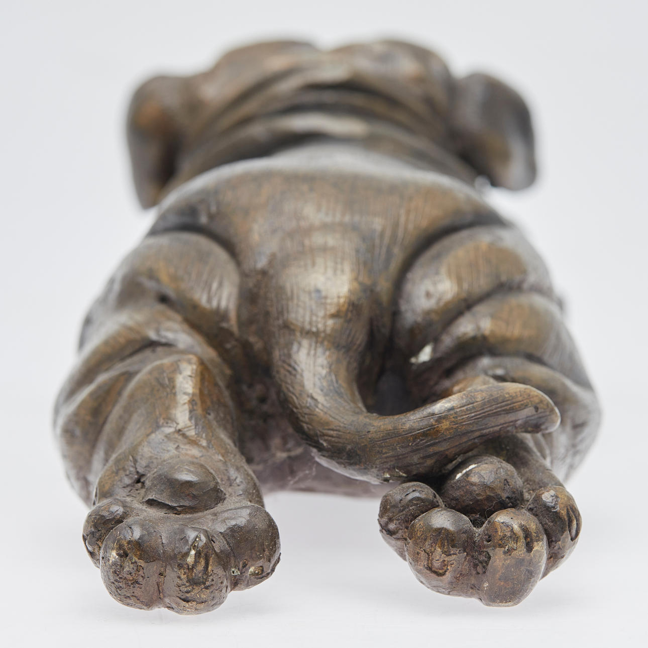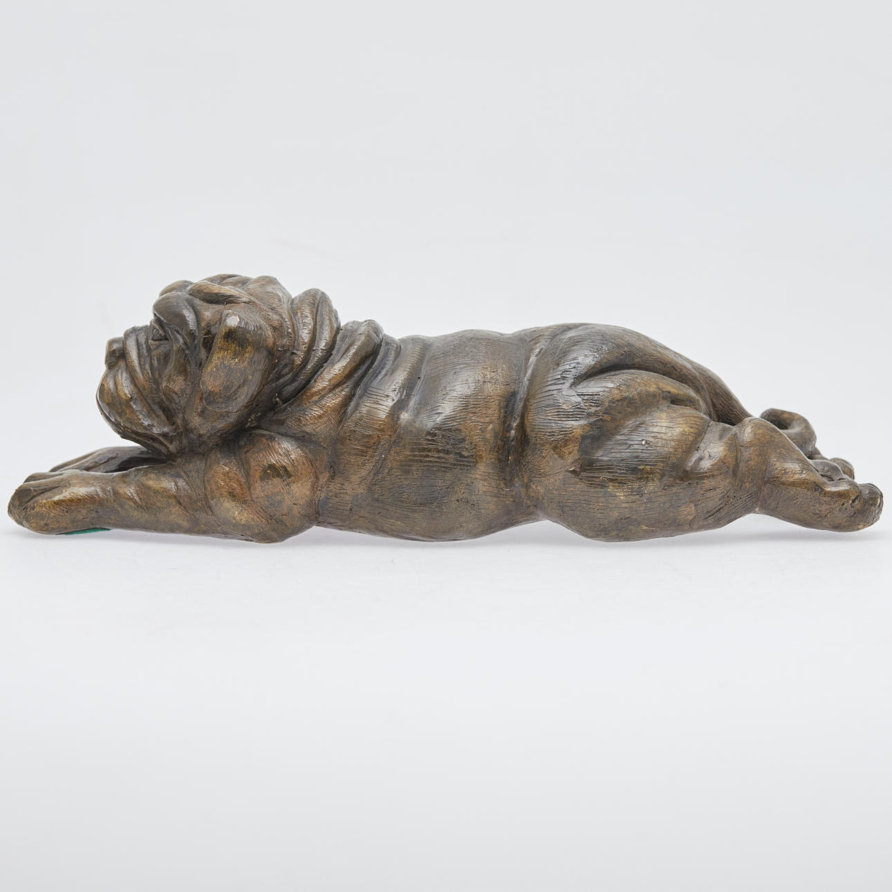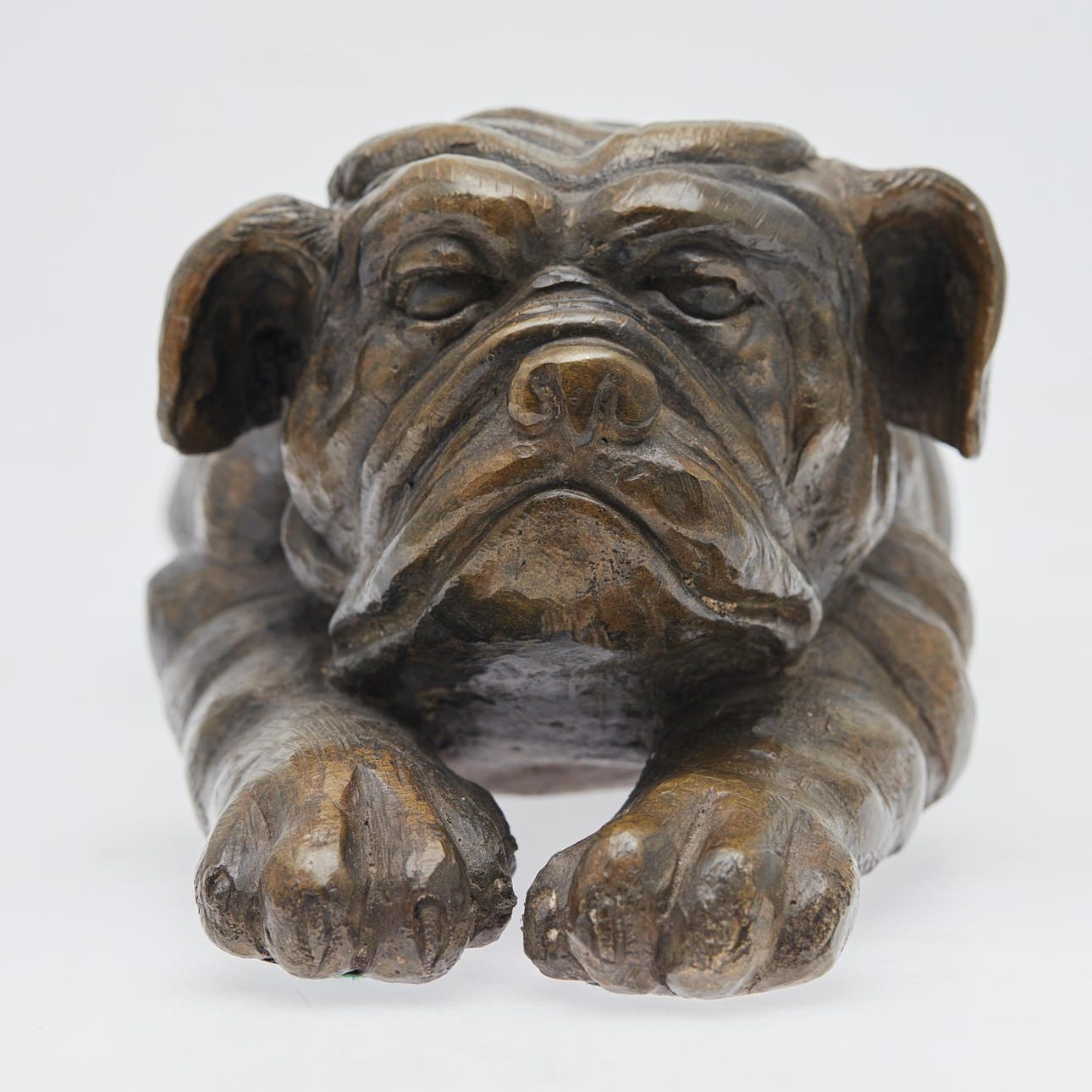 Skulptur/Figur, bulldogg, mässing, bronserad. Figur som visar en liggande bulldogg med utsträckta tassar, gjord av bronserad mässing, höjd 11 cm, längd 38 cm, bredd 12,5 cm.