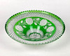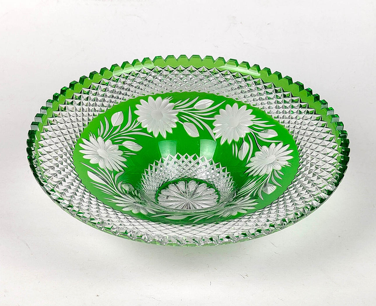 Färglöst kristallglas, handblåst, täckt i grönt och polerat för hand, bred svängande skålform med diamantbelagd och blommig dekoration, Ø ca. 30 cm, H ca. 9,5 cm.