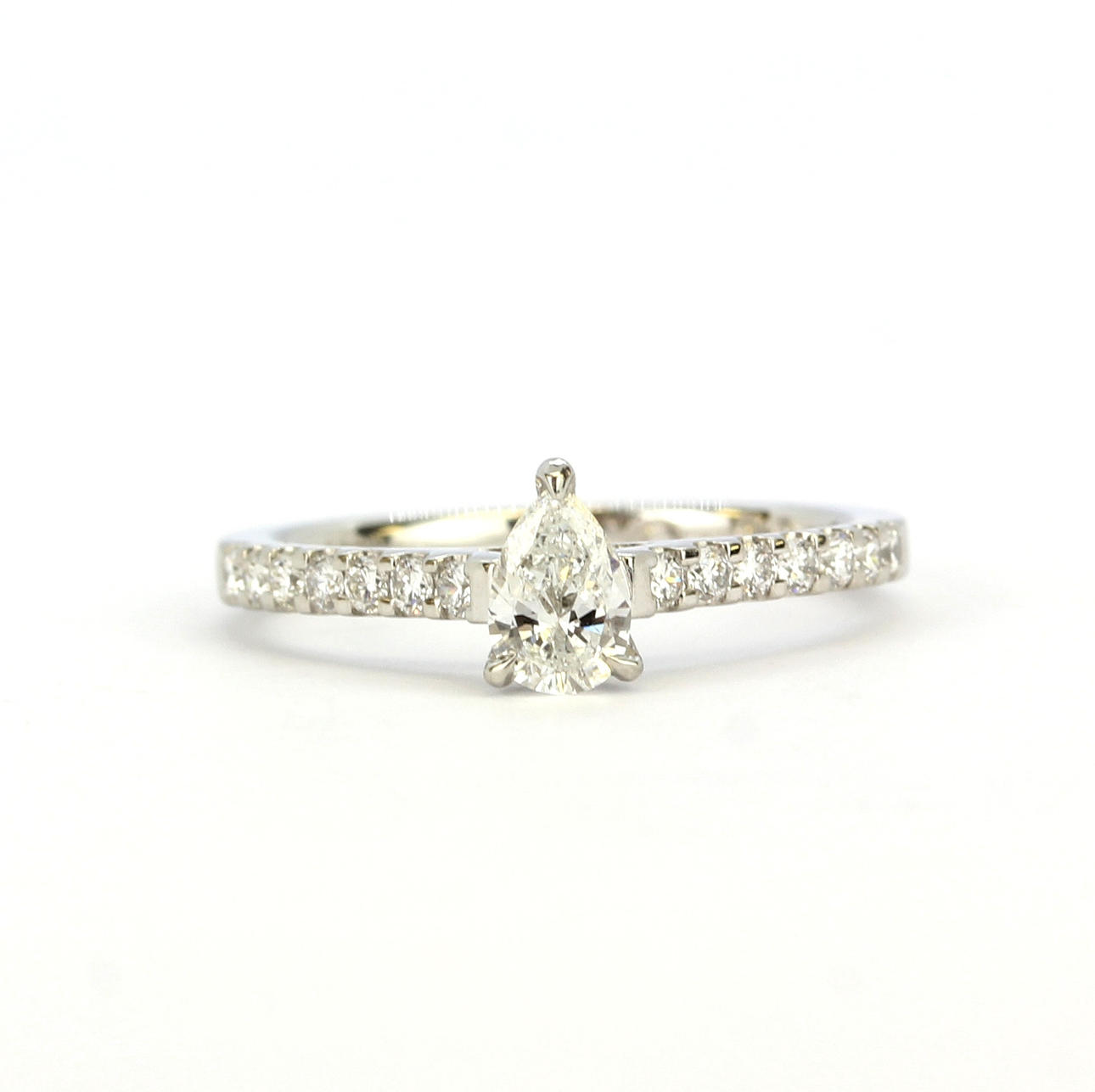 En 950 platina ring set med en päron briljantslipad diamant och diamant set axlar, med ett WGI certifikat, center sten 0.32ct, färg F, klarhet SI2, med 0.22ct på axlarna, (L.5).