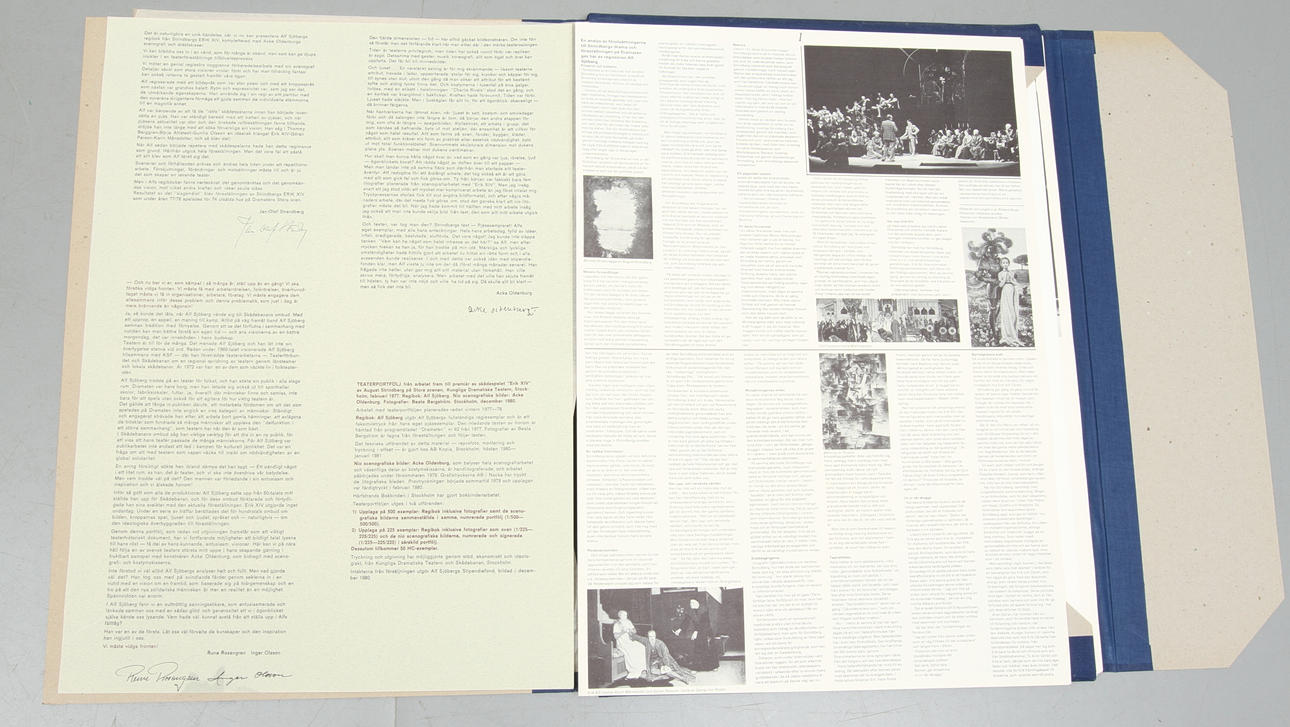"Teaterportfölj från arbetet fram till premiären av skådespelet ERIK XIV av August Strindberg på Stora Scenen, Kungliga Dramatiska Teatern, Stockholm februari 1977.".