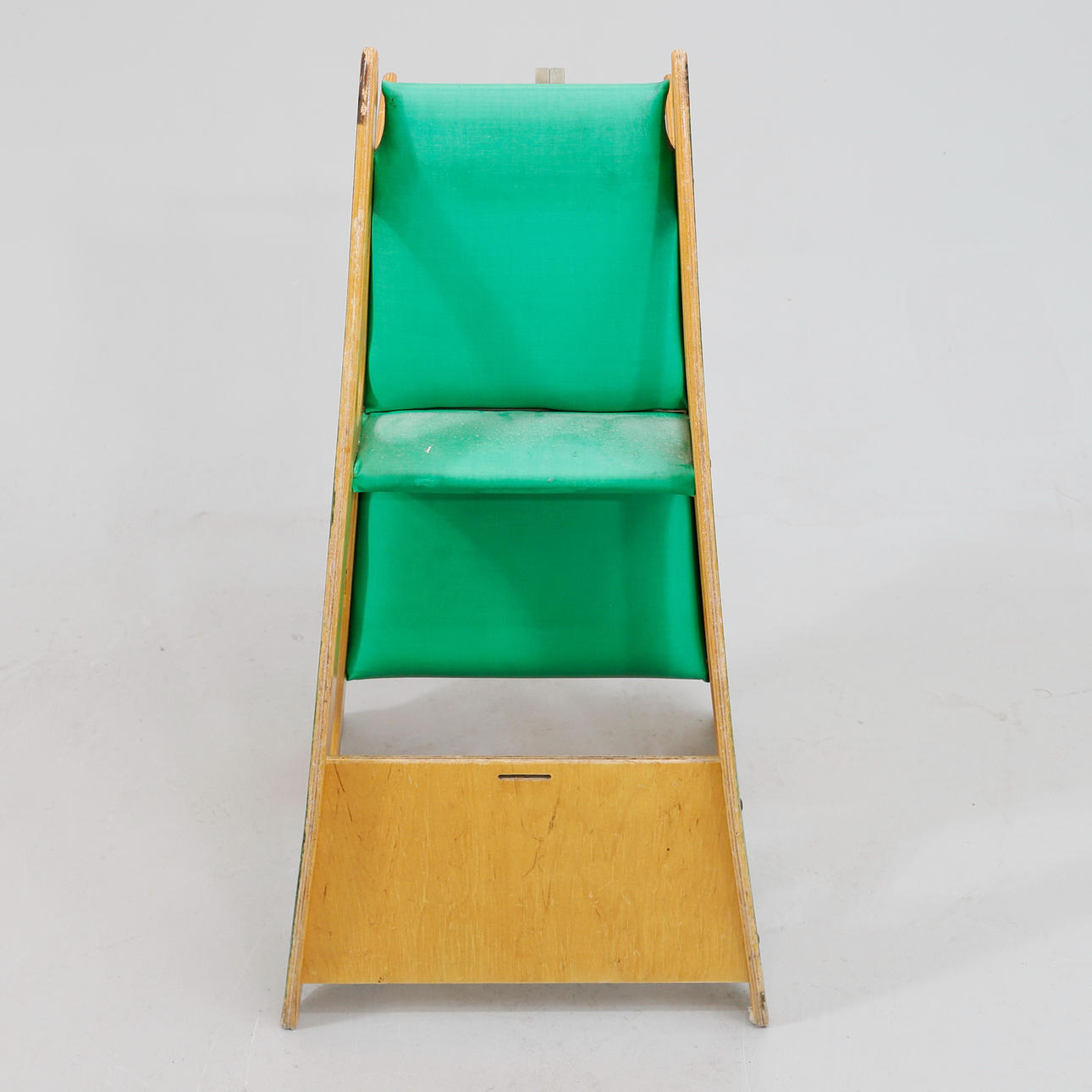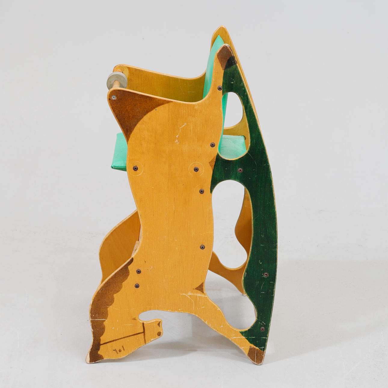 Stomme i trä. Delvis bemålat. Dubblerar som gunghäst. Etikettmärkt. Höjd, som stol, ca 85 cm.