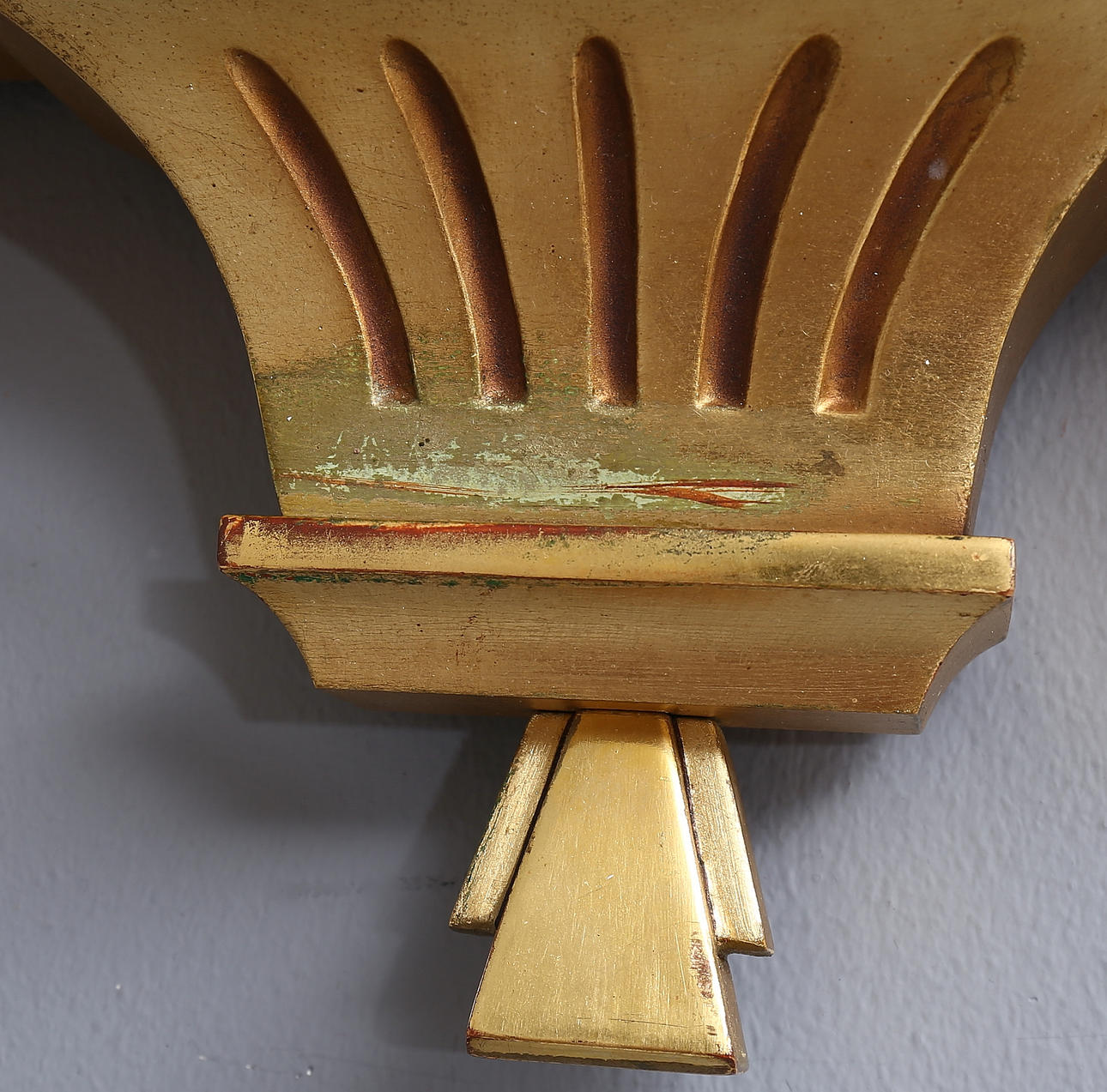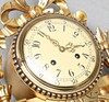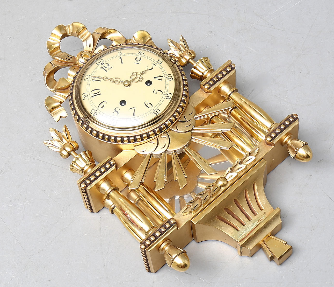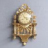 Förgylld med urhus uppburet av kolonnetter, krönande bandrosett. Bredd 33, höjd 55 cm. Pendel och urnyckel medföljer.