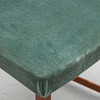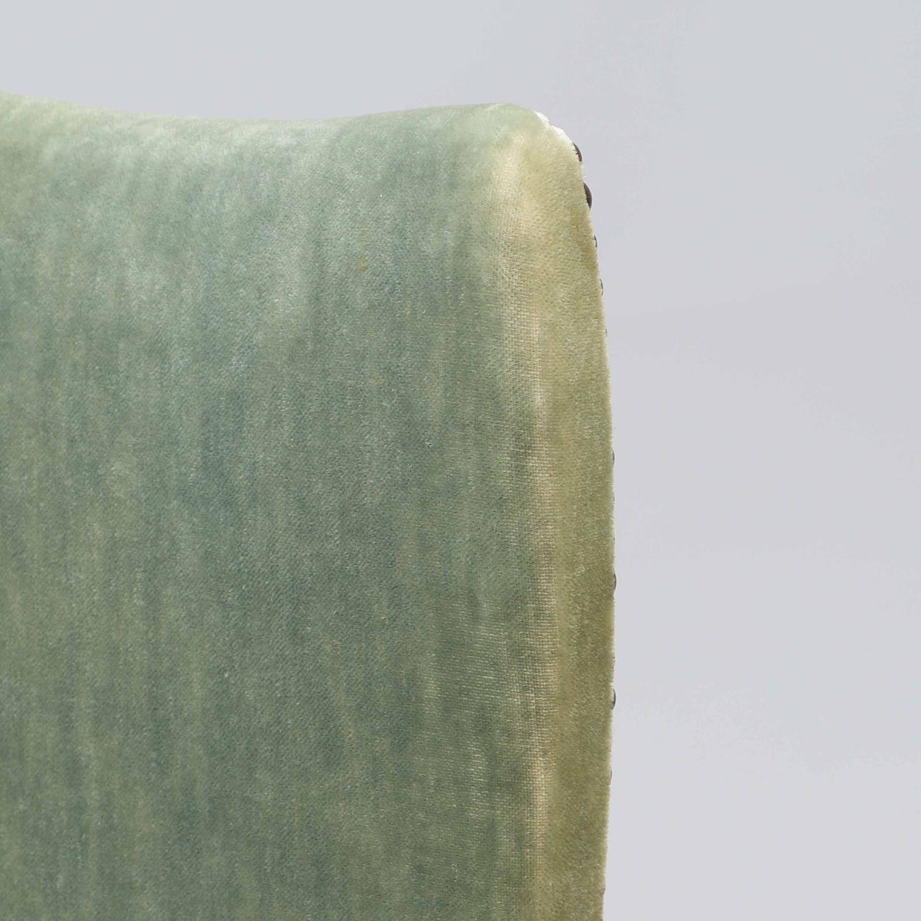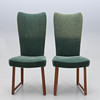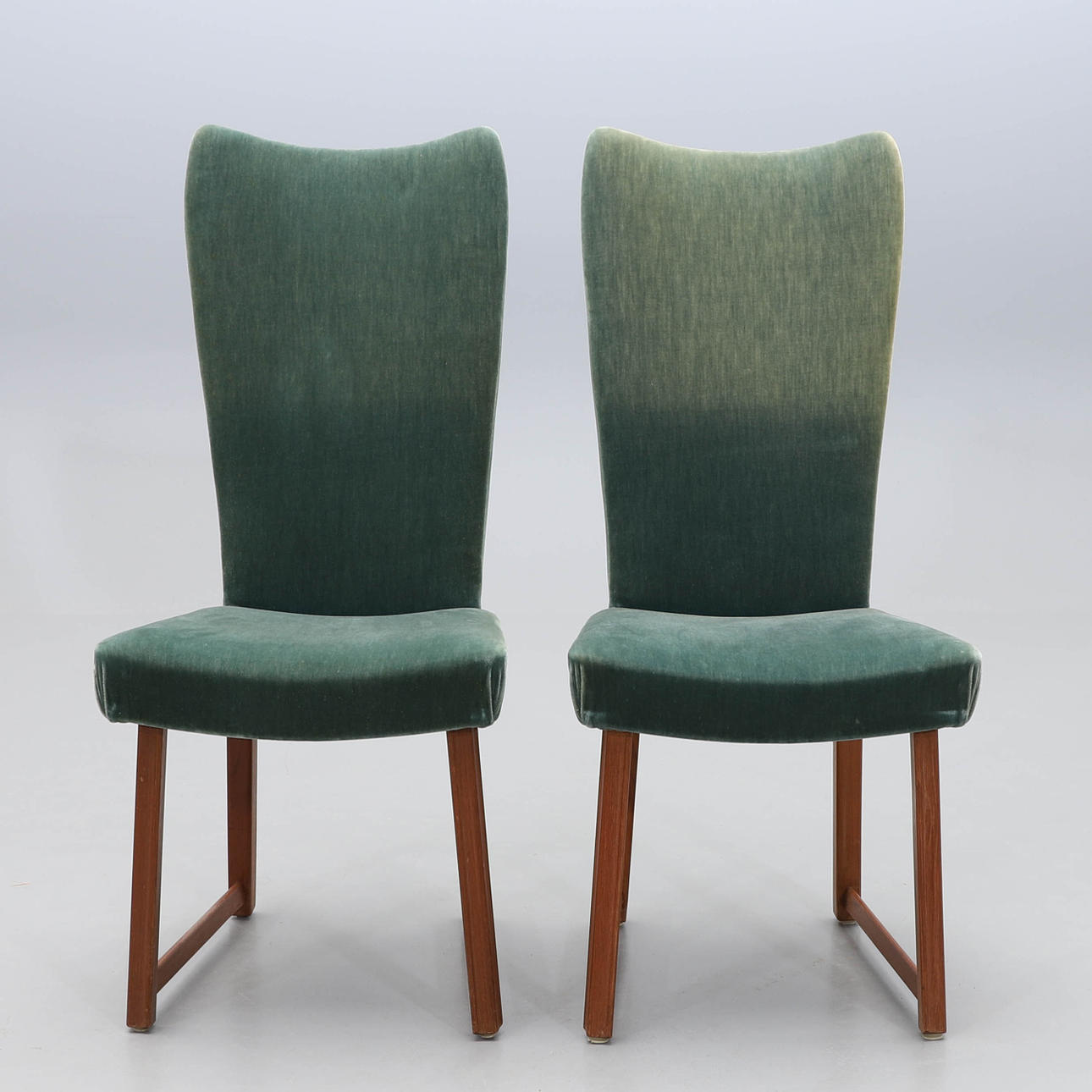 Helstoppade med hög rygg. Dekorspik. Raka kopplade ben i teak. Total höjd 108, sitthöjd c:a 48 cm.