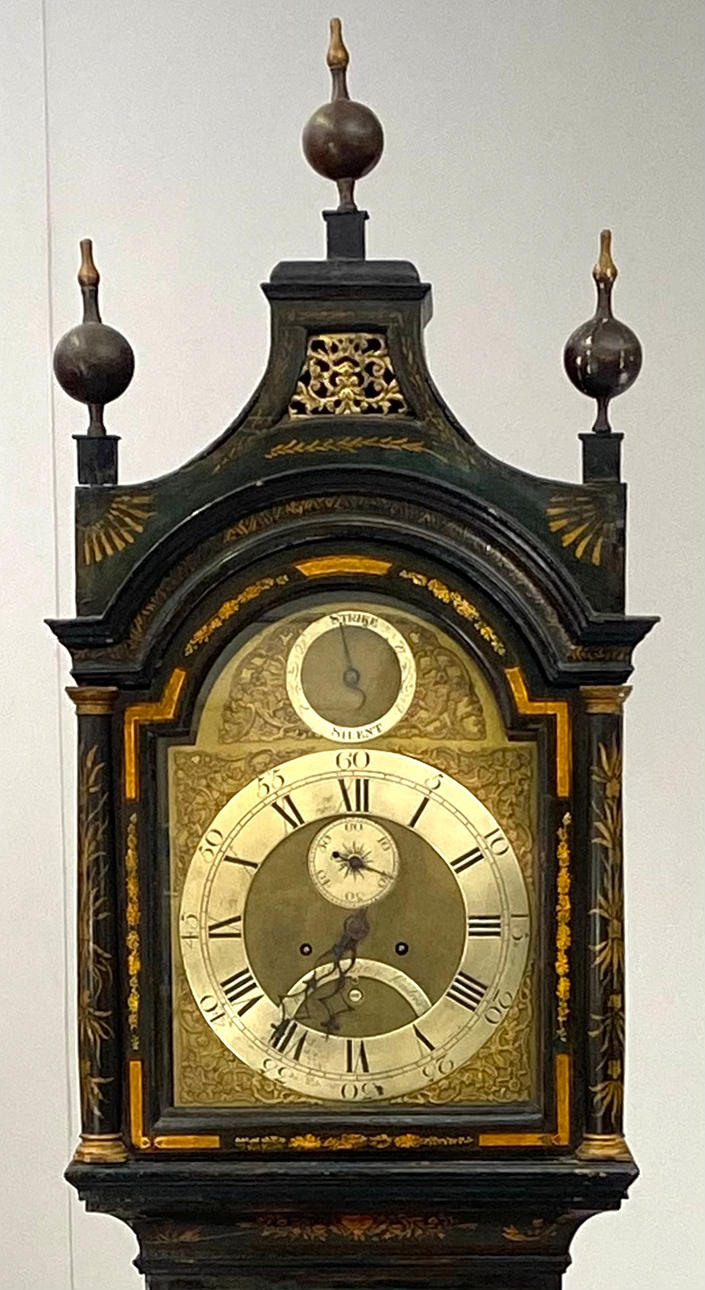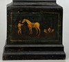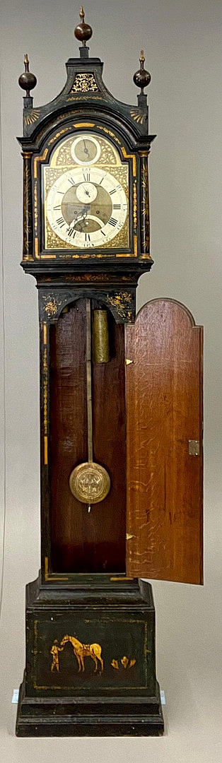 Eboniserad trälåda dekorerad med en chinoiseries motiv. Mässing urtavla med romerska siffror. Andra vid tolv.