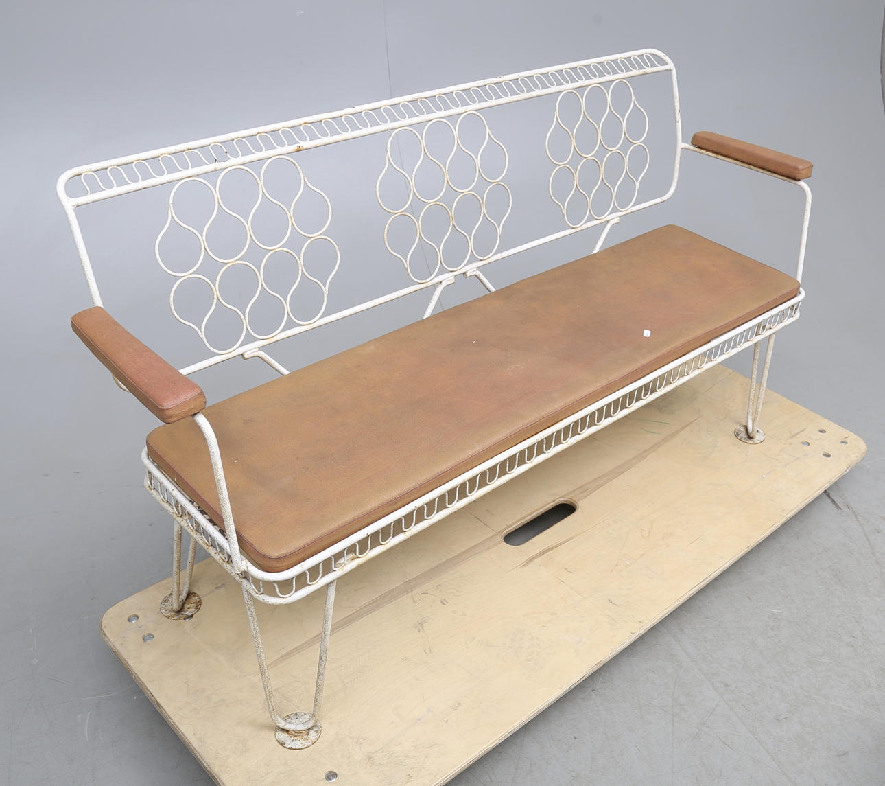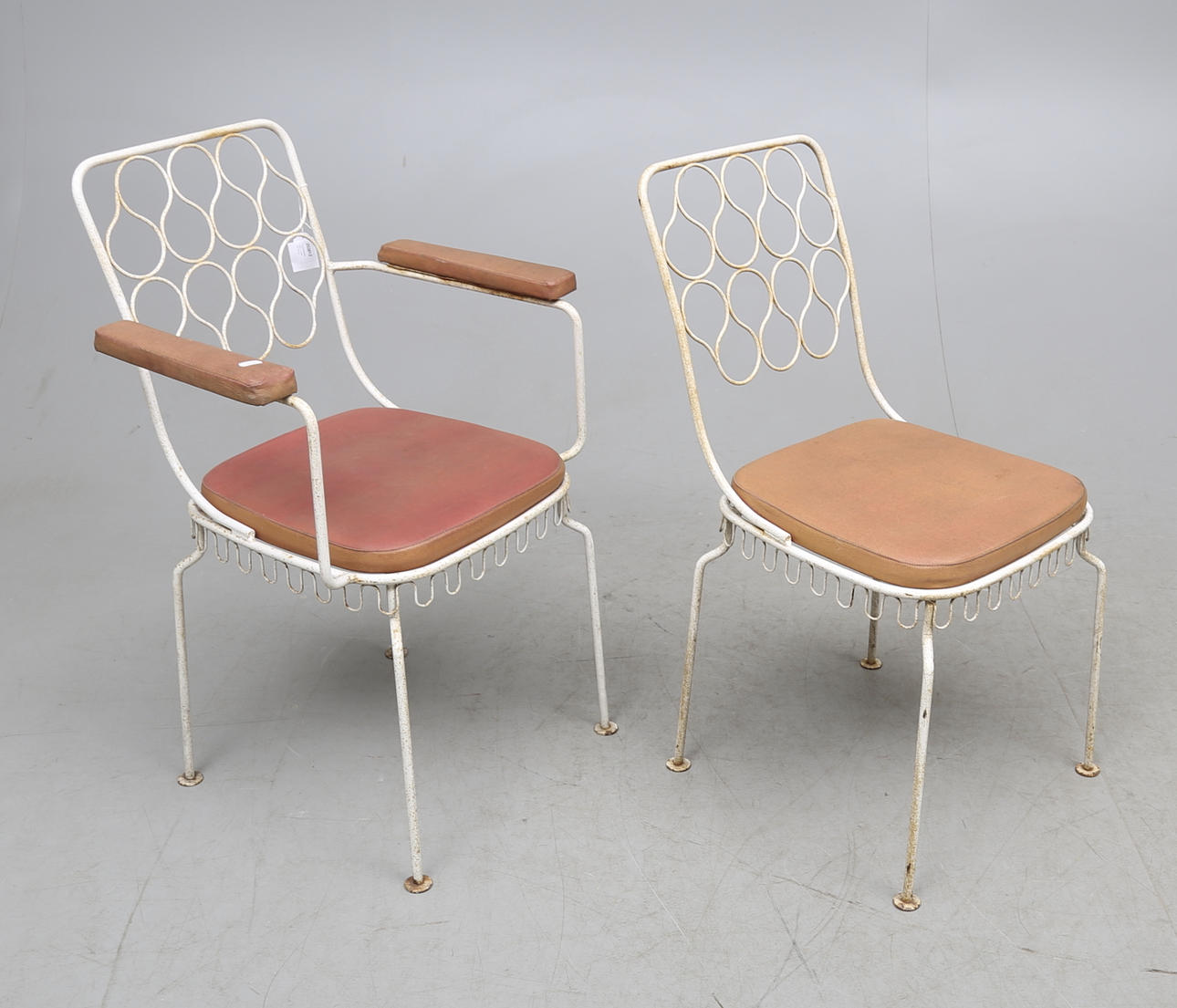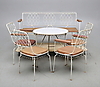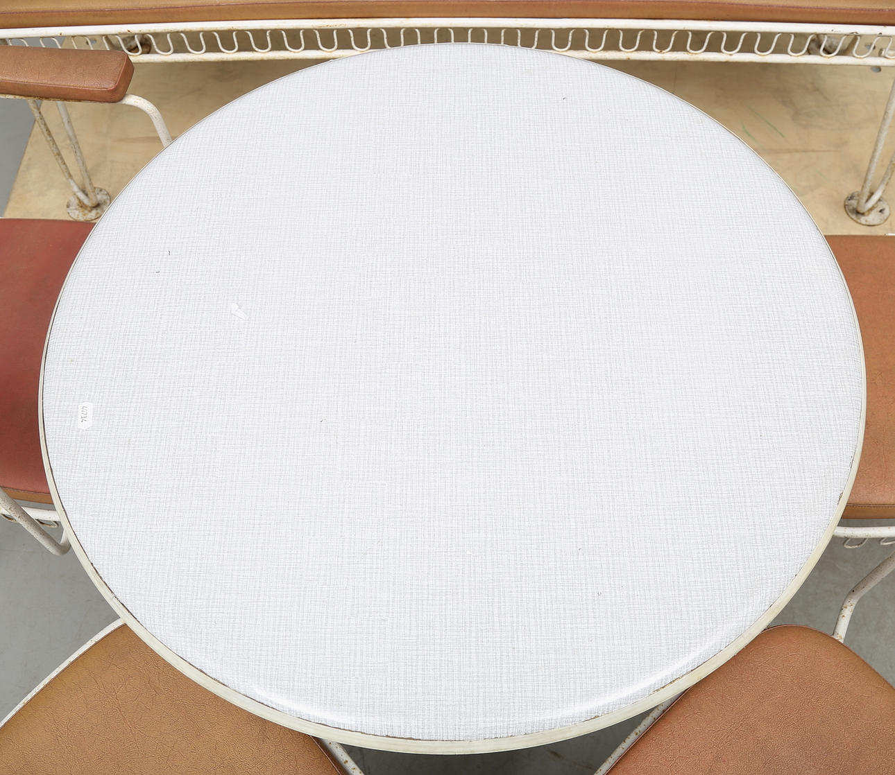 Soffa, längd ca. 151 cm. Bord, diameter ca. 70, höjd 70 cm. 2 karmstolar, 2 stolar.