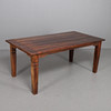 Matbord i betsa trä med metallinläggningar.