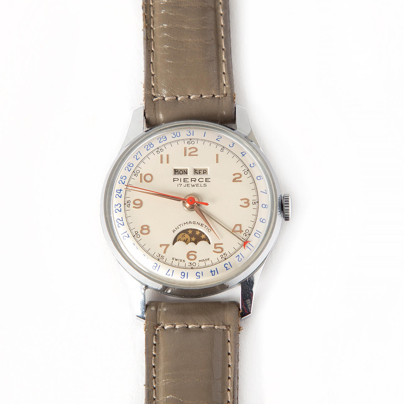 Stål samt krom. Manuellt uppdrag, kalender, månfas. Plexiglas. Original armband samt sölja. Diameter 33 mm. Etui samt originalcertifikat (ej ifyllt) medföljer.