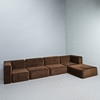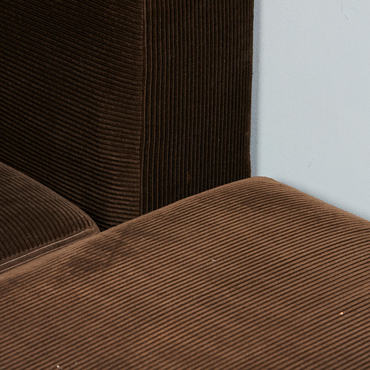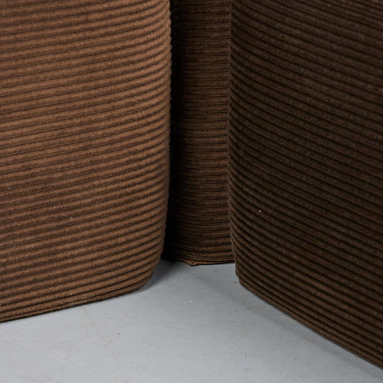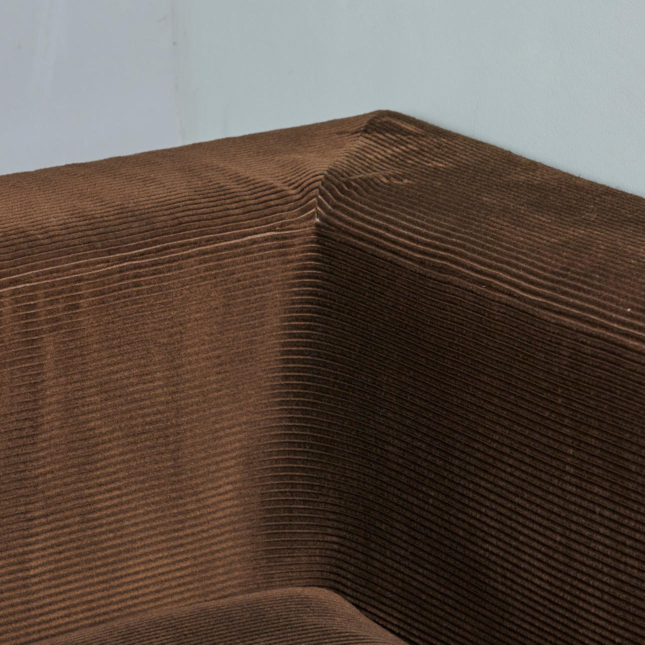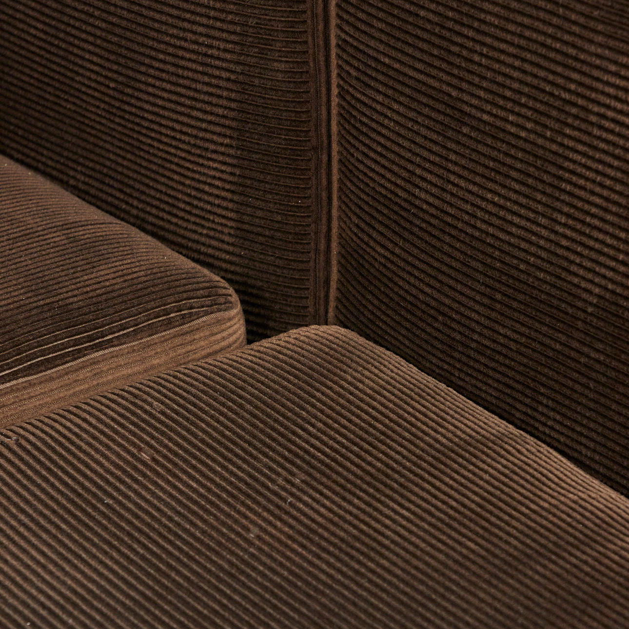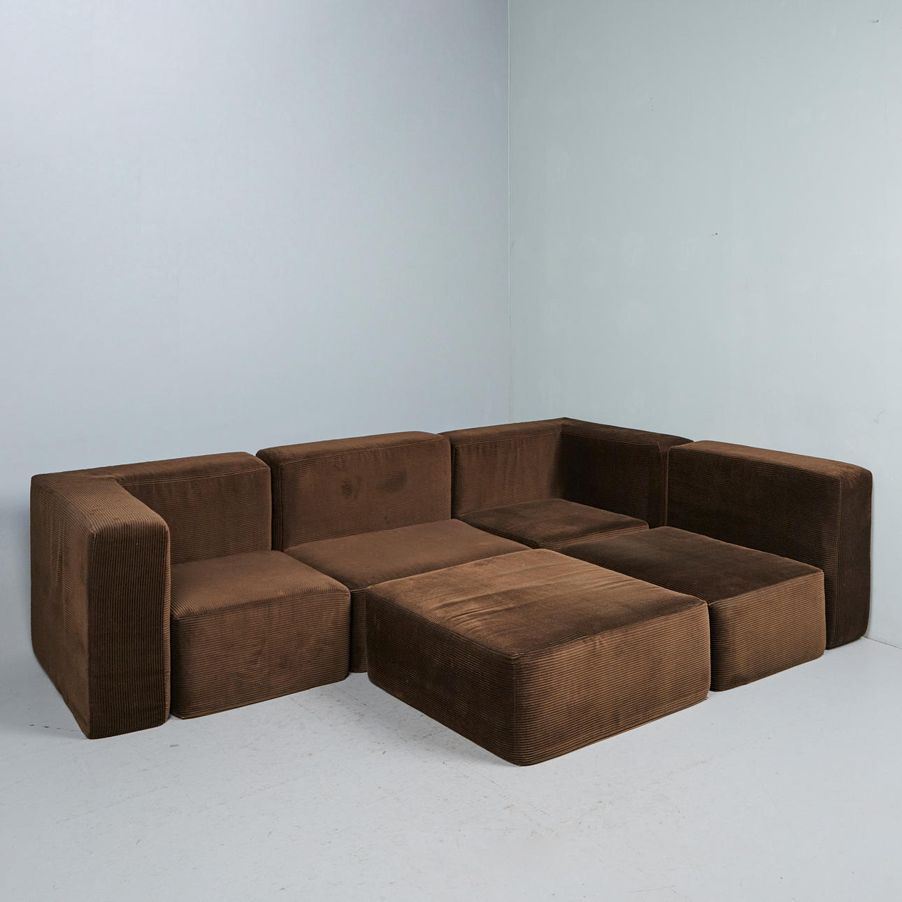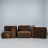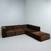 Modulsoffa/soffa, nio delar, manchester, 1970-tal. Modulsoffa bestående av nio stoppade bruna corduroy-moduler, inklusive fyra sittmoduler med två bakväggar och två hörnmoduler samt en pall, moduler vardera: H.80cm, sitthöjd: 40cm, W.85cm, D.90cm, pall: 35cm, L.90cm, W.90cm. (9).