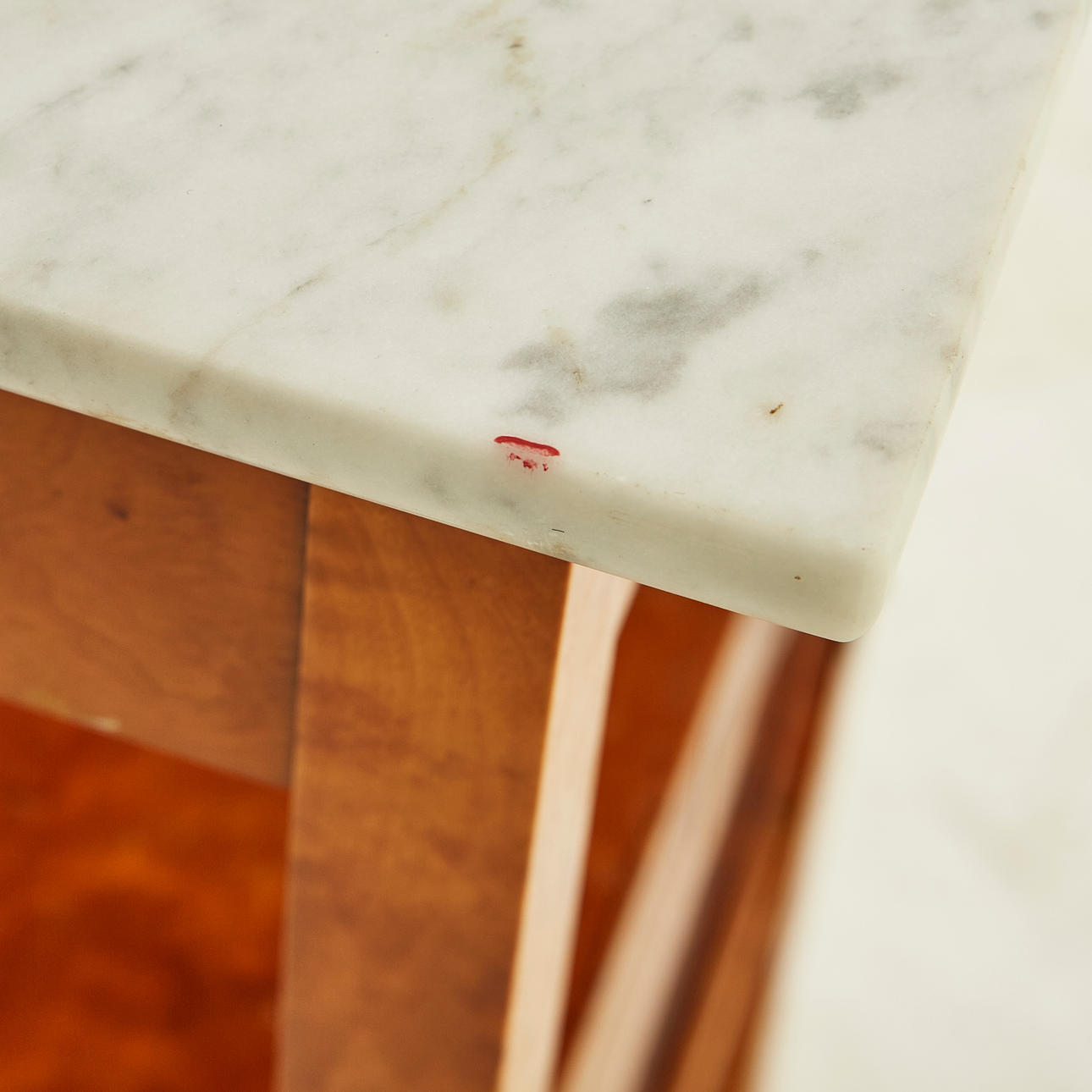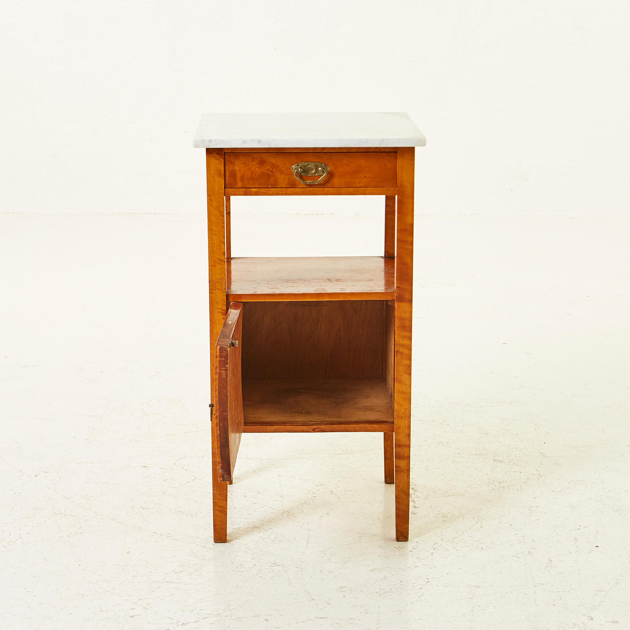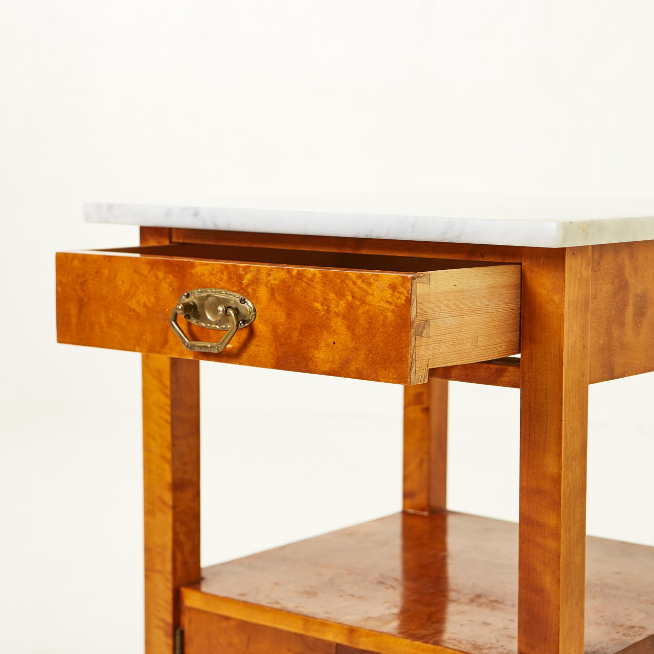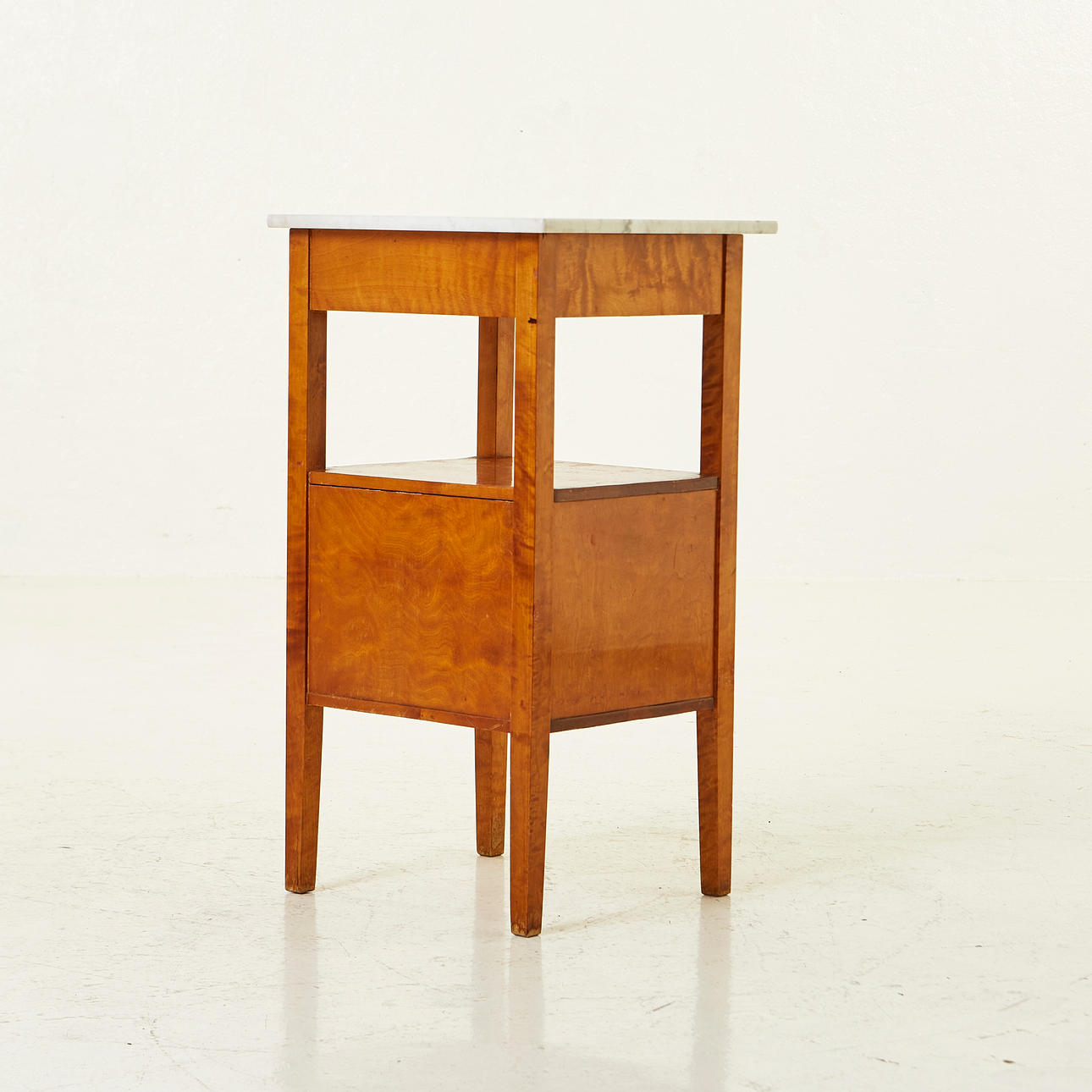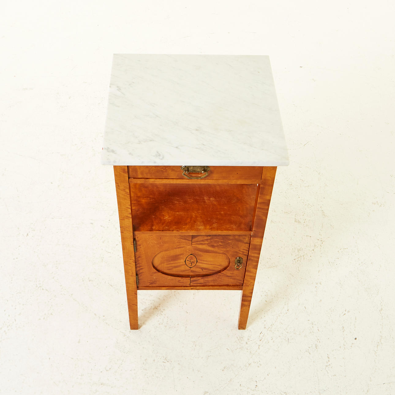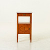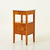 Rak form, skiva av marmor. En låda, hylla samt skåp med dörr dekorerad med inläggning iform av ros. Längd 40 cm, bredd 40 cm, höjd 70 cm.