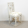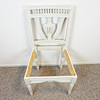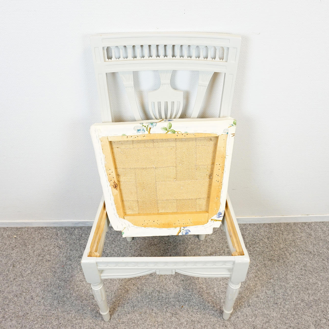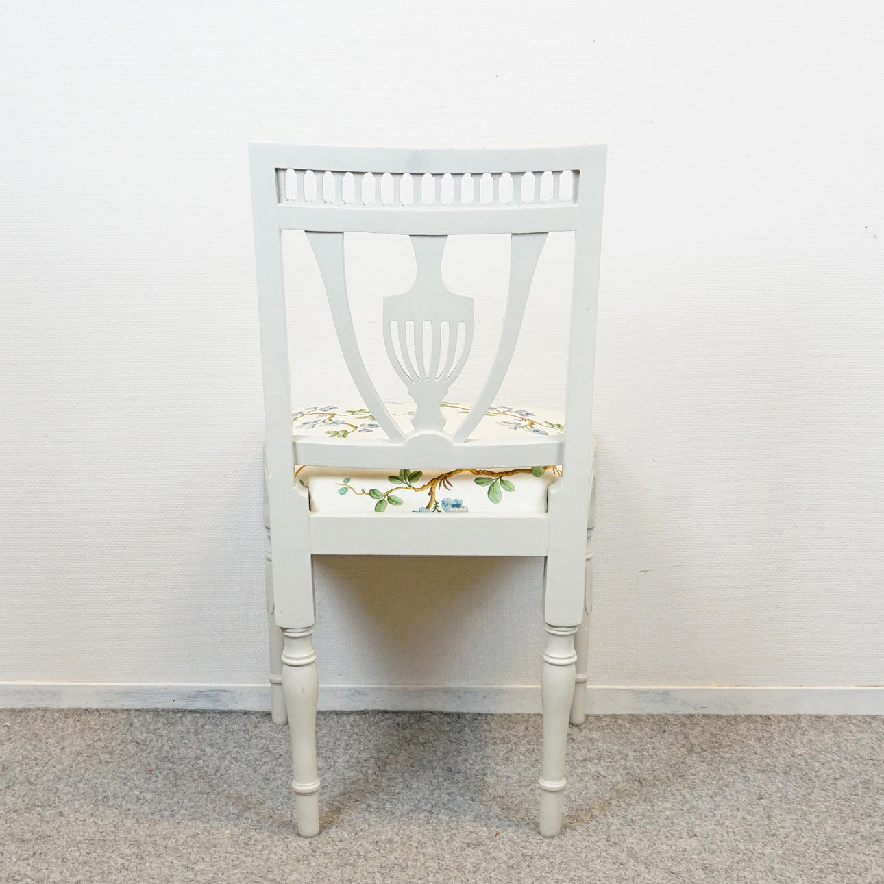 Grå bemålning. Genombruten ryggbricka med dekor av bl a urna. Lös stoppad tygklädd sits. Rygghöjd 86 cm, sitthöjd ca 47,5 cm.