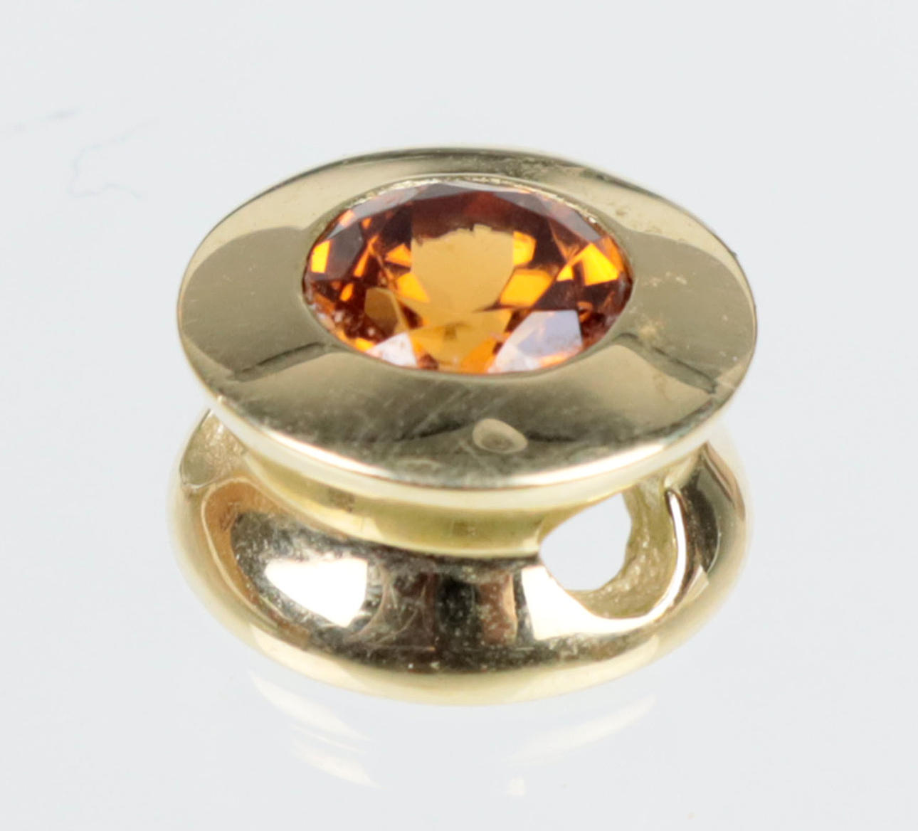 stämplad 585 gult guld (14 karat), ca. 3.5 gram, diabolo-format hänge på ca. 10 mm diameter med dold kedjedrag, med Madeira Citrin på ca. 6 mm diameter, rundad.