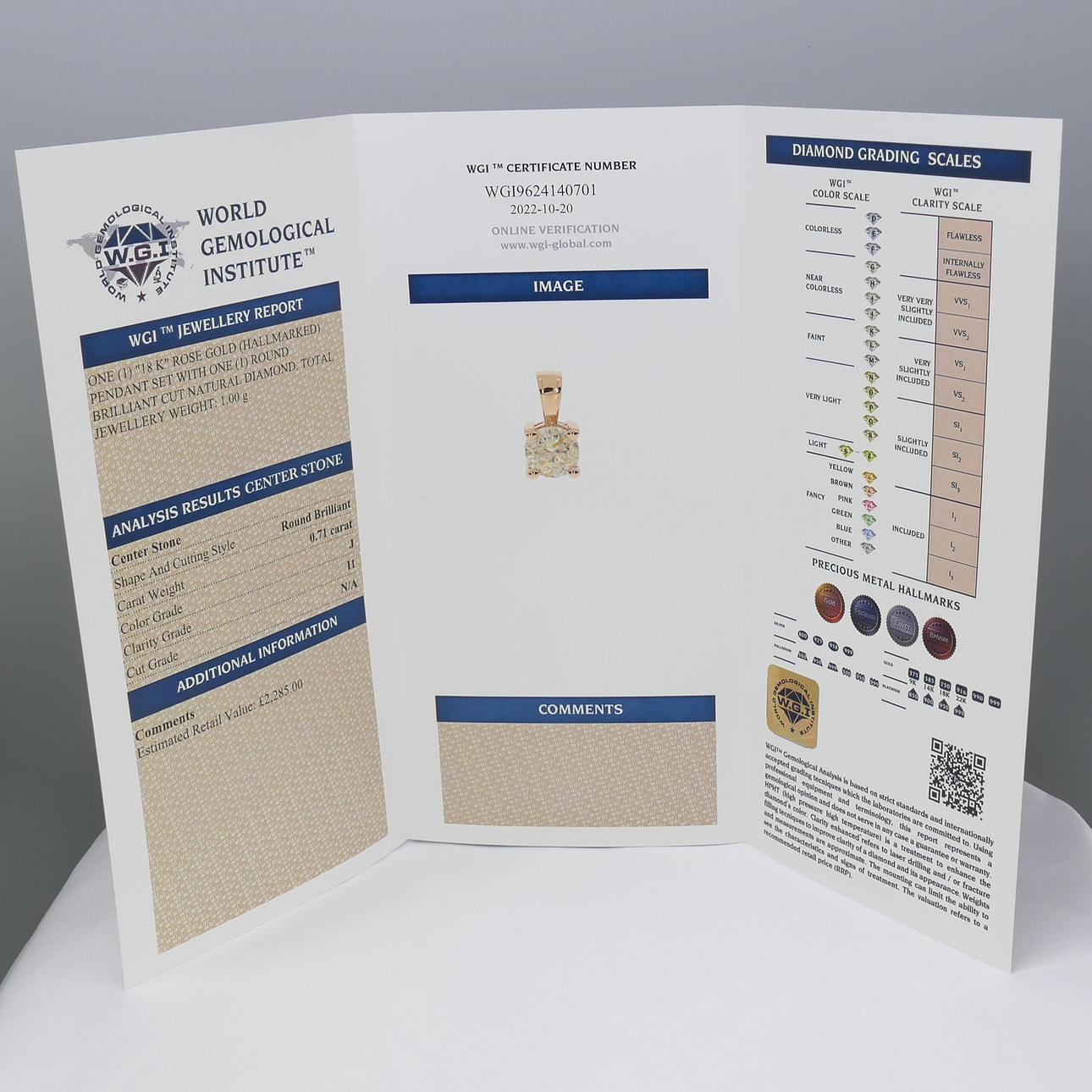Här är detaljerna som anges i World Gemological Institute certifikat nr. WGI9624140701: